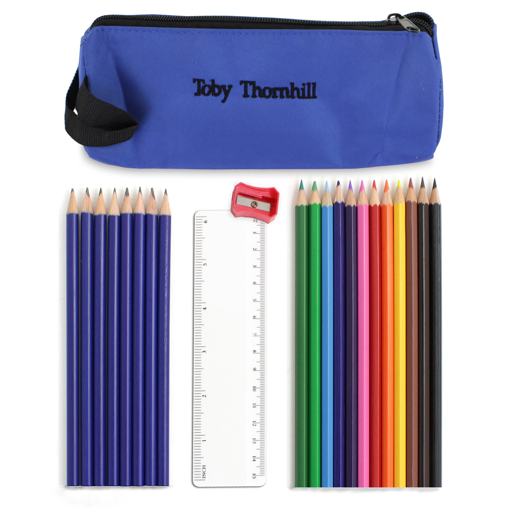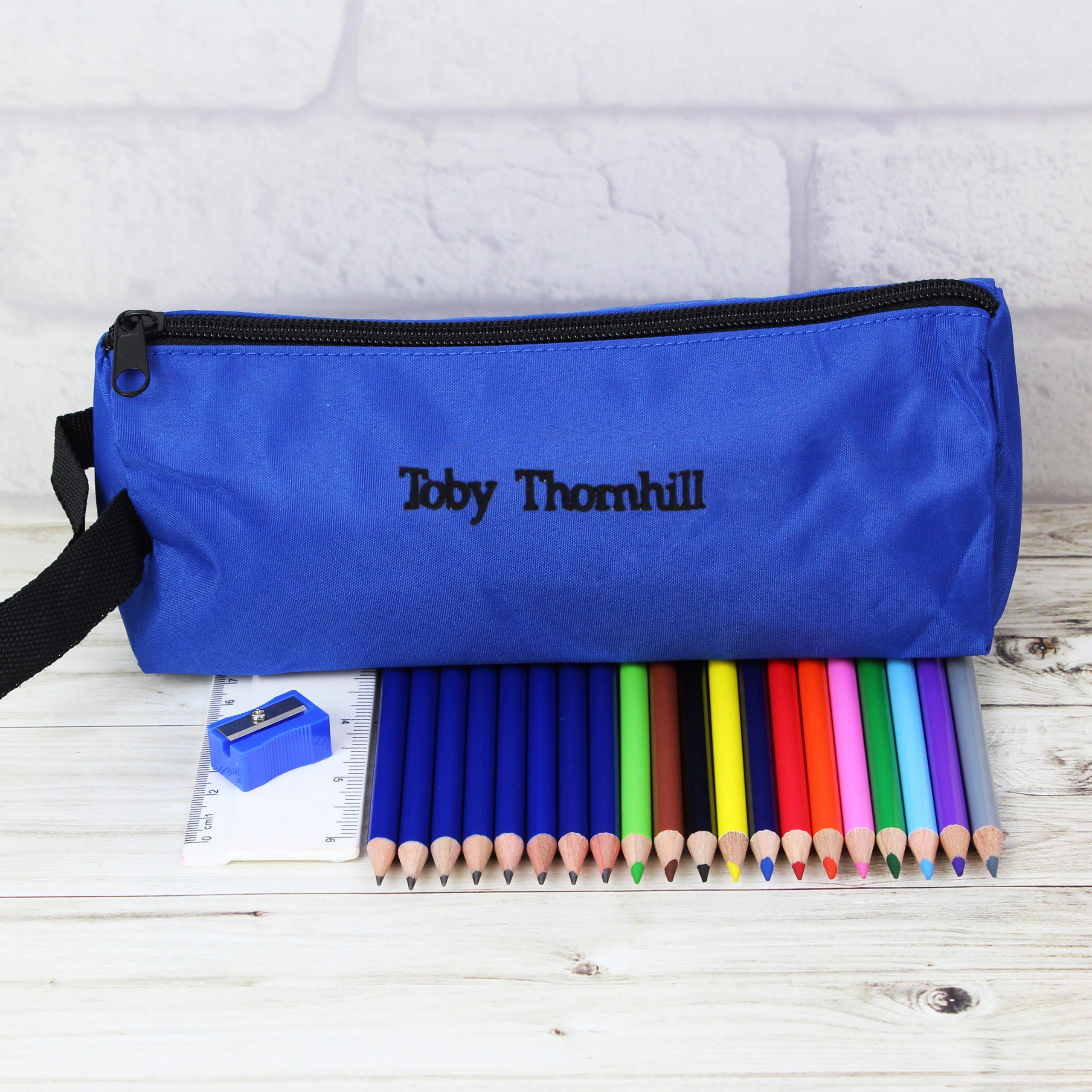 A great gift for school this microfiber pencil case is embroidered with any name up to 22 characters. Contains a pack of 12 colouring pencils, 8 pencils and a 6 inch ruler, Also comes complete with handy pencil sharpener. The colour of pencil sharpener may vary.Due to the nature of this product and the font type used please refrain from using all capitals in your personalised message.