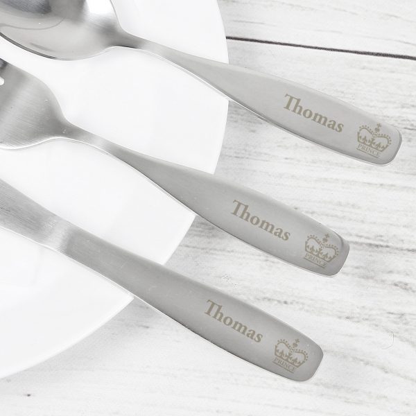 This 3 Piece Crown Cutlery Set is a unique gift for any young prince.This stainless steel cutlery set can be personalised with any name up to 15 characters.All personalisation will appear as entered.Please note the word ‘Price’ is fixed textPlease note – Not suitable for children under 36 months.Cutlery measurmentsFork 14.2cmKnife 16.8cmSpoon 13.7cmIdeal for Birthday, Christening, Confirmation, Naming Day, Baptism.