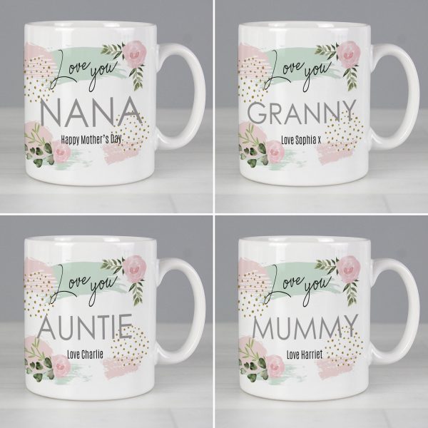 This beautiful floral mug is the perfect gift for that special lady in your life!You can personalise this mug with the following:””Love You”” On the front of the mug is fixed text. Front of mug:Line 1 (Name) – Up to 12 CharactersLine 2 – Up to 20 charactersReverse of mug:You can personalise the reverse of this mug with up to 4 lines of 20 characters per line.Please avoid using block capitals as this could make the personalisation hard to read.Hand washing is recommended.Material is ceramic.Ideal for Mother’s Day, Valentine’s Day, Birthdays.