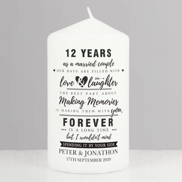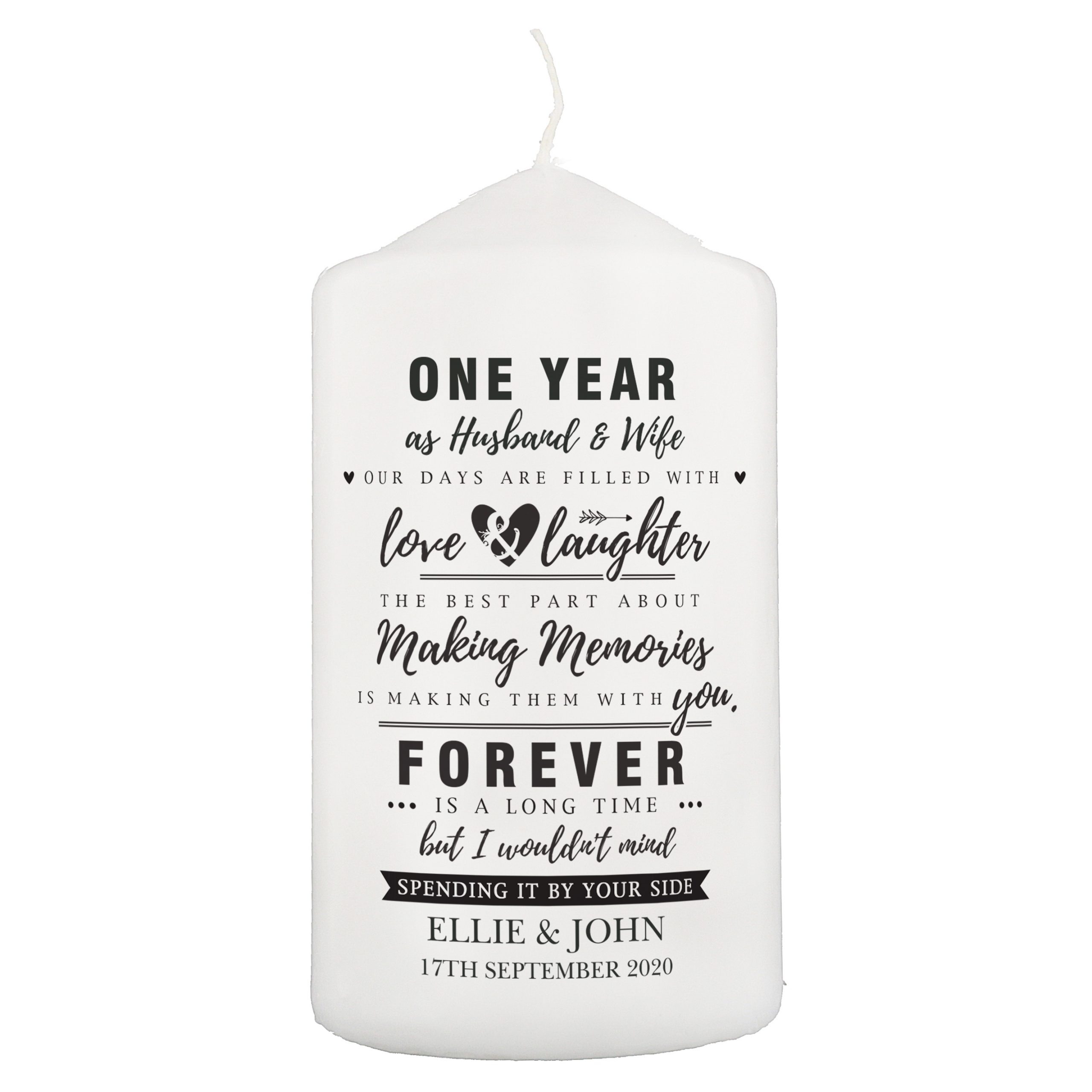This Personalised Candle makes the perfect Anniversary present.Personalise this Candle with up to 2 lines of 25 characters at the top, this is the first 2 lines. You can also personalise this Candle with up to 2 lines of 25 at the bottom, this is the last 2 lines.The fixed text reads;OUR DAYS ARE FILLED WITHlove & laughterTHE BEST PART ABOUTMaking MemoriesIS MAKING THEM WITH you.FOREVERIS A LONG TIMEbut I wouldn’t mindSPENDING IT BY YOUR SIDEWhat’s more, this candle comes presented in an organza bag.Burn time approx. 58 HoursIdeal for, Anniversaries