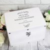 This stunning Antique Scroll White Keepsake Box is a perfect way of storing precious mementoes. The keepsake box can be personalised with a message over 4 lines of text, with up to 20 characters per line. Line 4 will appear slightly smaller.Please note that all text entered will appear in upper case.The box has a leather effect finish and features metal studs along the edging with a metal clasp lock. The interior of the box is lined with a soft fabric.The box can be used to store photographs, wedding cards, invitations and other small keepsakes. It’s ideal for storing mementoes from a special Birthday, anniversary or even a honeymoon. Ideal for Mother’s Day, Weddings, Anniversaries, Birthdays, For Her, For Grandma.