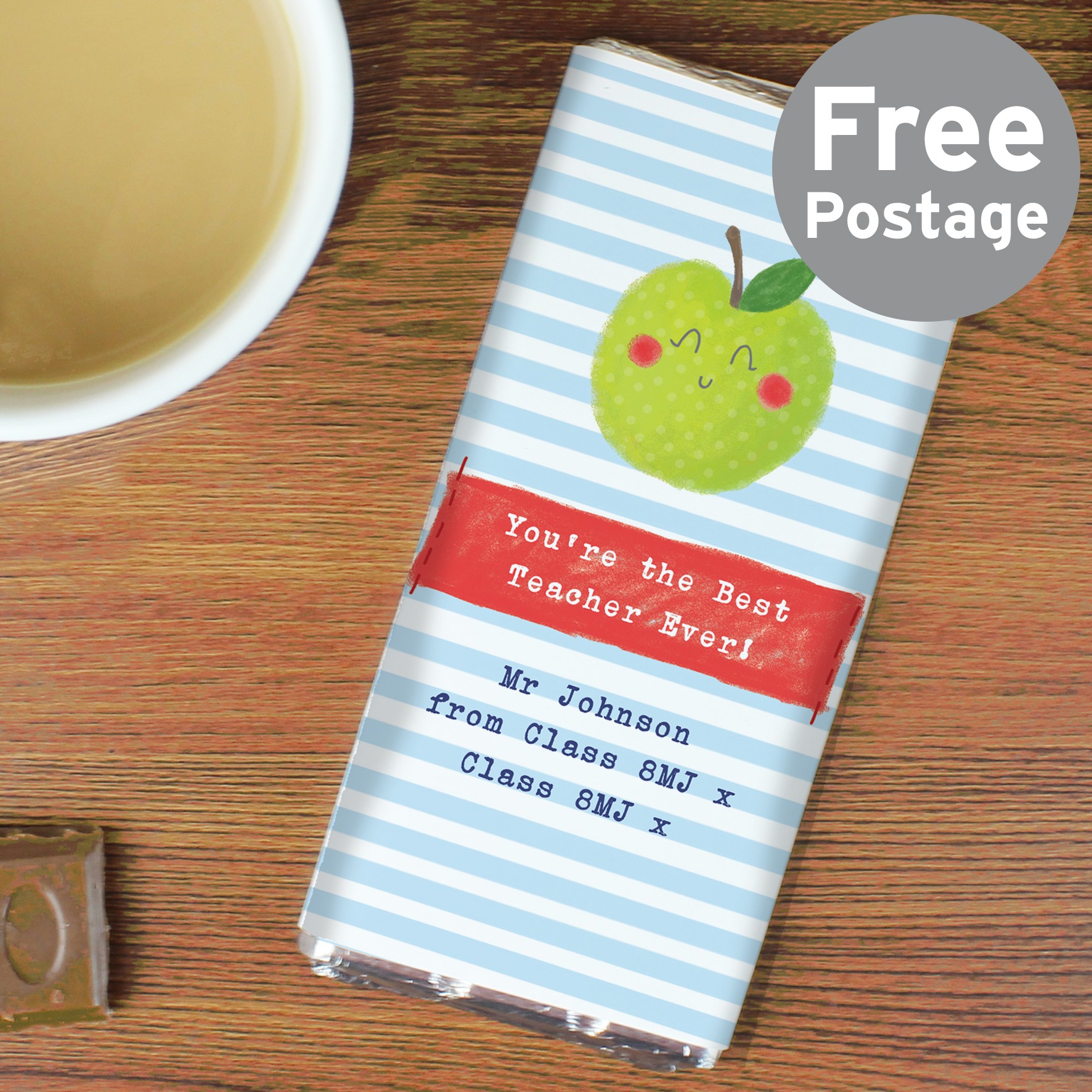 A delicious, sweet surprise for their favourite teacher. This chocolate bar is sure to go down a treat! This Happy Apple Milk Chocolate Bar can be personalised with 5 lines of text on the front and an additional 4 lines of text on the reverse. Each line of text can fit 20 characters per line. Please note that all personalisation is case sensitive and will appear as entered. For best results, please avoid entering text in block capitals as this may make the personalisation difficult to read.Our great value chocolate includes free standard delivery. Milk Chocolate Bar15cm x 7cm x 1cmWeight 100gMay contain traces of nutsWith ‘Kawaii’ being very popular, this Happy Apple design is well on trend.Ideal for Teachers, School’s Out and Christmas.
