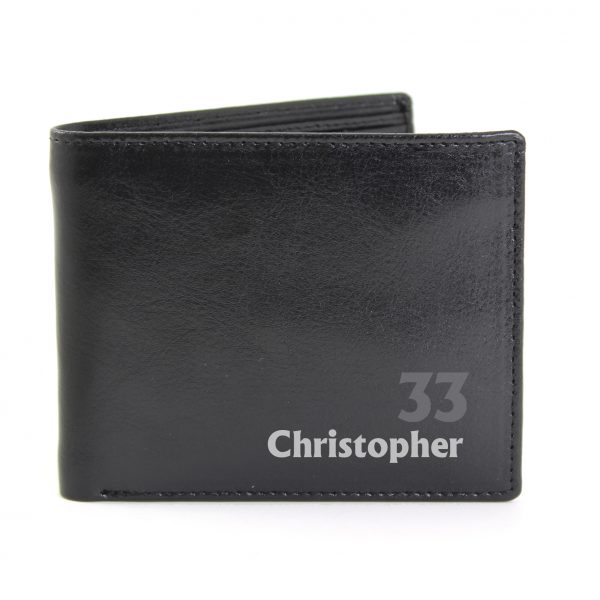 Personalise this leather wallet with any name of up to 12 characters, and an age of up to 2 characters.Leather is the material for a 3rd Wedding Anniversary and this wallet would make the perfect gift!Wallet includes a Change Holder, 3 Card Slots & Notes Holder.Material is leatherIdeal for Birthdays, Father’s Day.