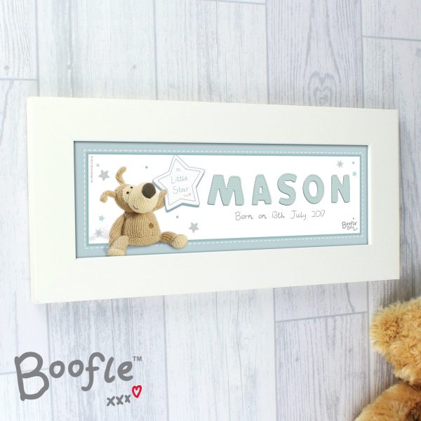 Our Personalised Boofle Name Frame will look the part hung in any bedroom or nursery!The name frame can be personalised with a name up to 15 characters and then followed with a message up to 30 characters in length.The words ‘a Little star’ are fixed.The name will automatically appear in UPPERCASE. All other personalisation is case sensitive and will appear as entered, however, due to the font used please avoid entering all your text in block capitals as this may result in the personalisation being difficult to read.To finish this stylish piece of art, each piece is mounted and framed in a large white frame. Ideal for New Borns, Christenings, Birthdays.