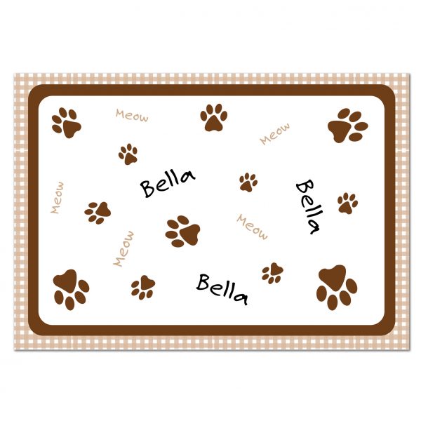 Personalise this Brown Gingham Cat Placemat with a pets name using up to 12 characters. ‘Meow’ is fixed text.This personalised placemat aims to keep your floor free from scratches, spills and crumbs.Fully Laminated.Ideal for Pets.