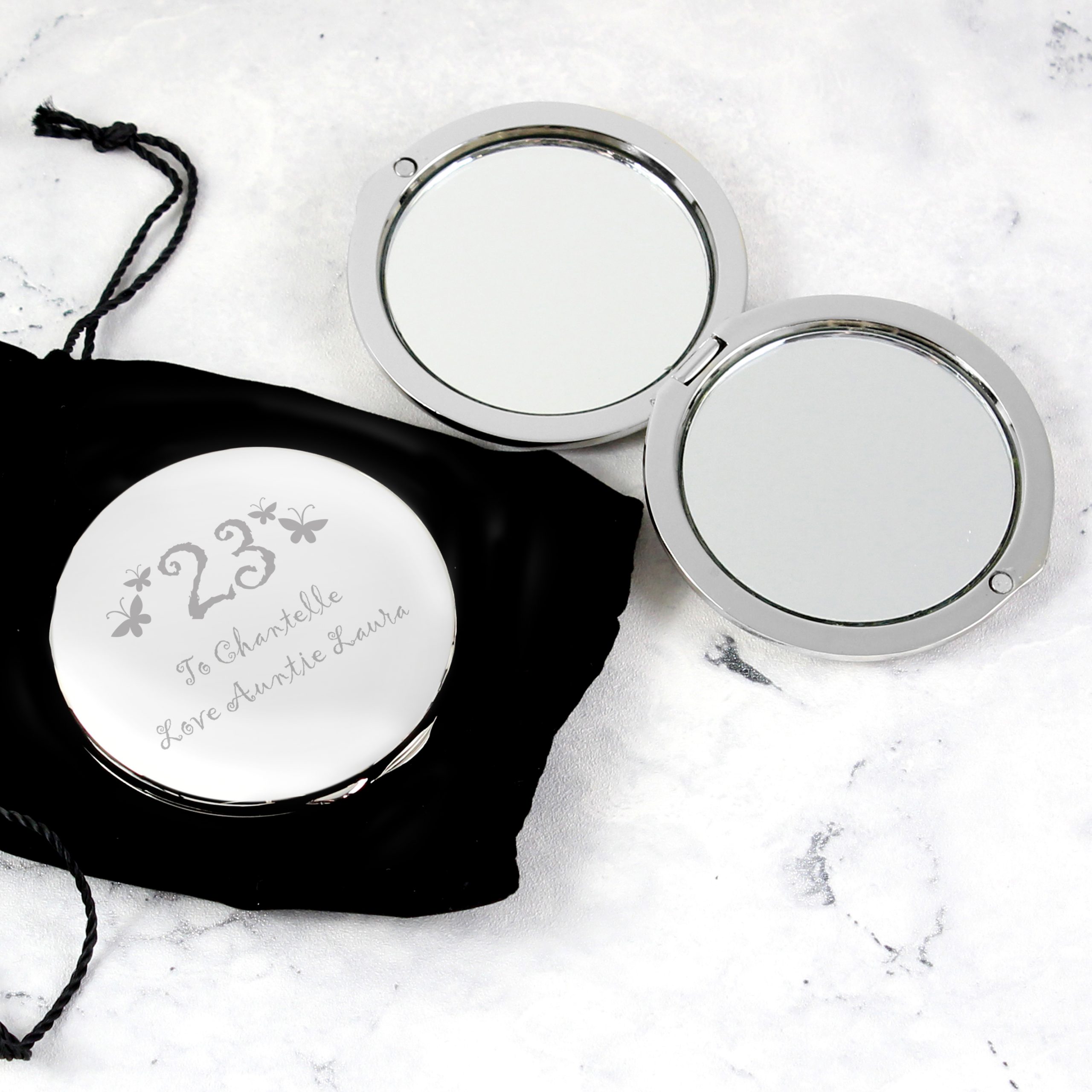This silver finish round compact mirror features a butterfly motif and can be personalised with any age up to 2 characters and message up to 20 characters per line over 2 lines.Ideal for Anniversary, Mothers Day, Wedding, BirthdayPLEASE NOTE: Due to the font type used please refrain from using all capitals in your personalised message. If the message is all in capitals you will find the personalisation extremely difficult to understand and may even result in personalisation being missed off the product. Many thanks for your cooperation.