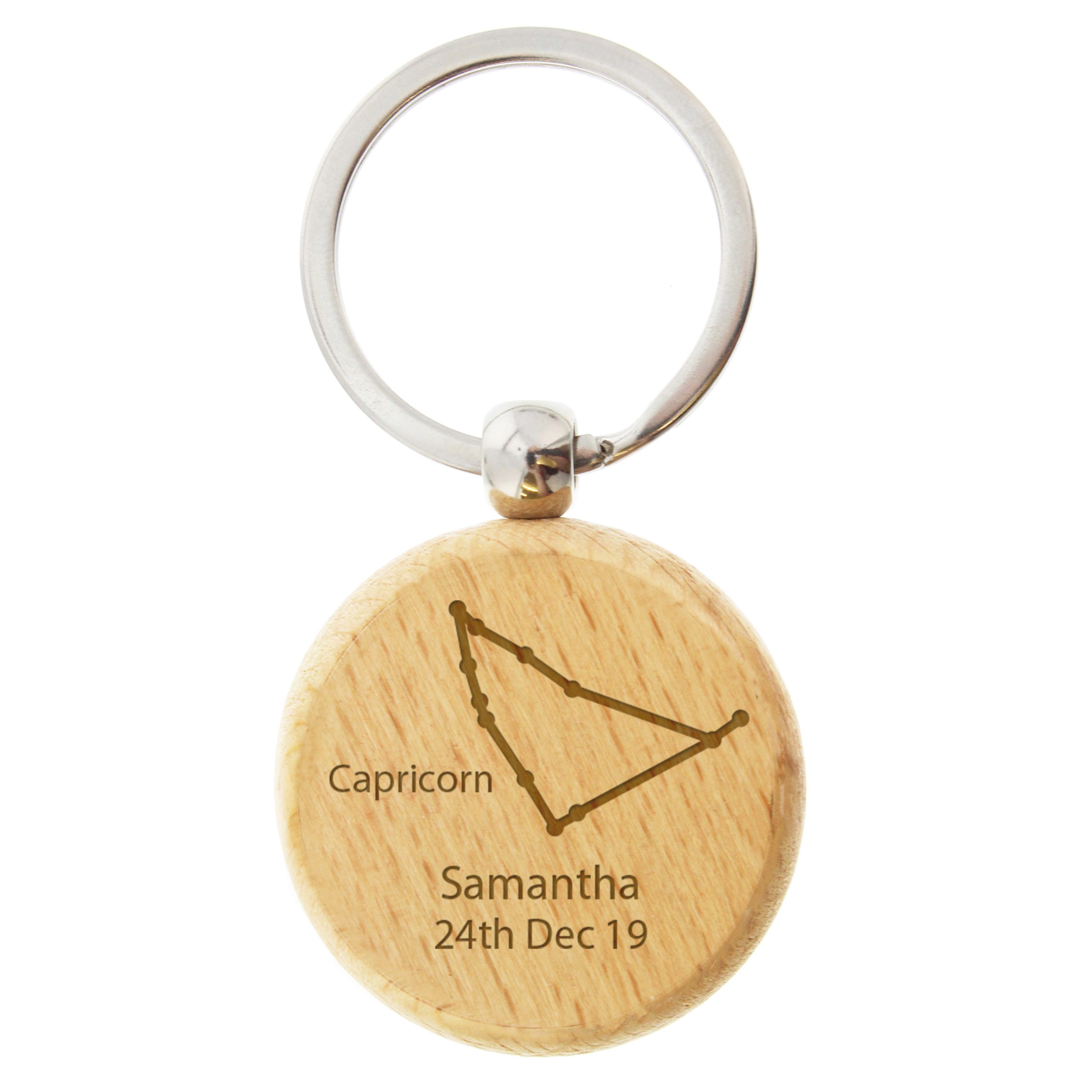 Our Personalised Zodiac Capricorn Wooden Keyring (December 22-January 19th) is a lovely way to help anyone celebrate their special day.The keyring can be personalised with any name up to 12 characters and any date up to 12 characters.’Capricorn’ is fixed text.All text is case sensitive and will appear as entered.The keyring is made from solid beech wood which has a smooth finish, and comes in a black card gift box.Ideal for Birthdays.