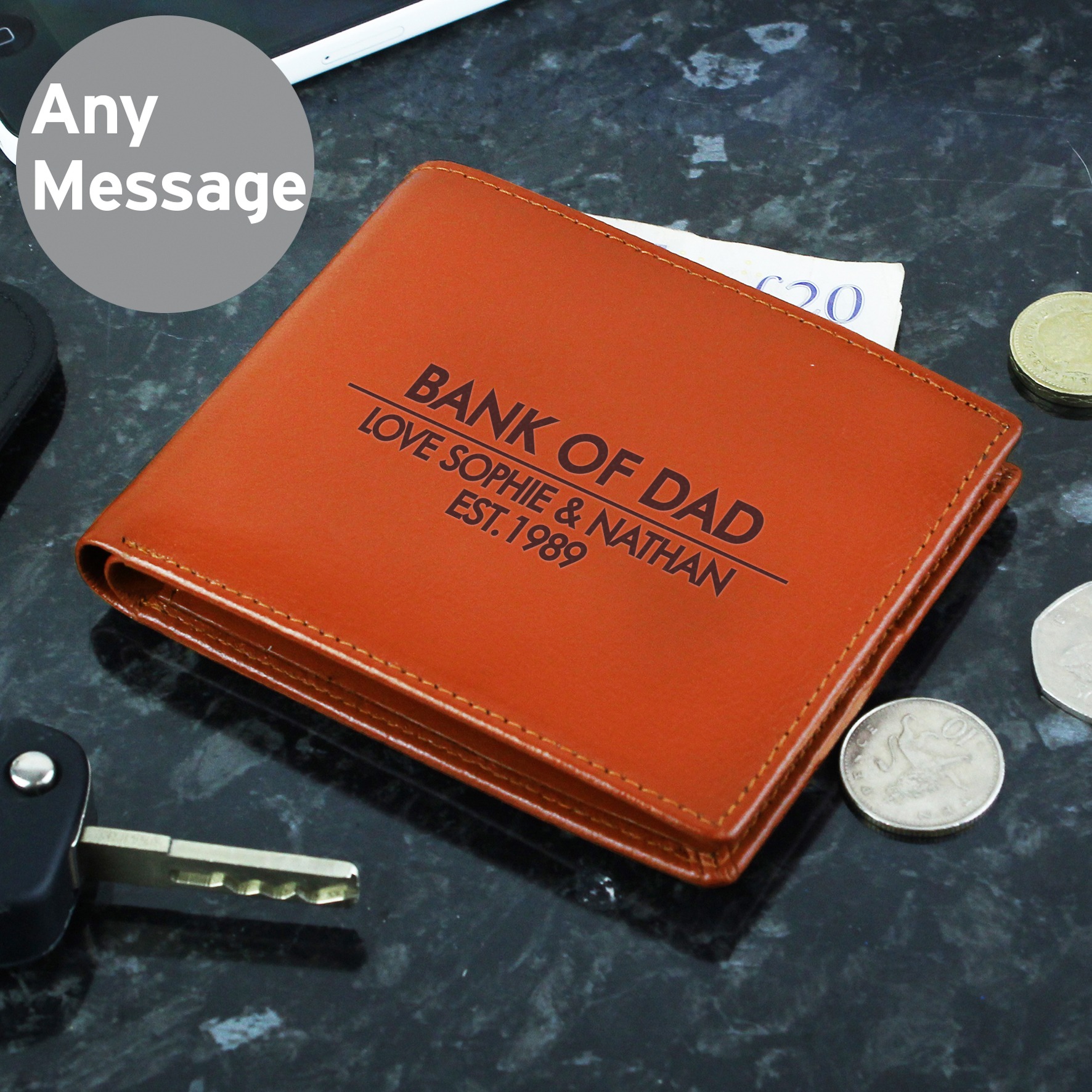 Personalise this leather wallet, with a name up to 15 characters and a message over 2 lines up to 20 characters per line.All text will appear in fixed uppercase.Leather is the material for a 3rd Wedding Anniversary and this wallet would make the perfect gift!Wallet includes a Change Holder, 6 Card Slots & Notes Holder.Material is leather.Ideal for Birthdays, Father’s Day, Wedding gift, Thank You presents, Christmas gifts.