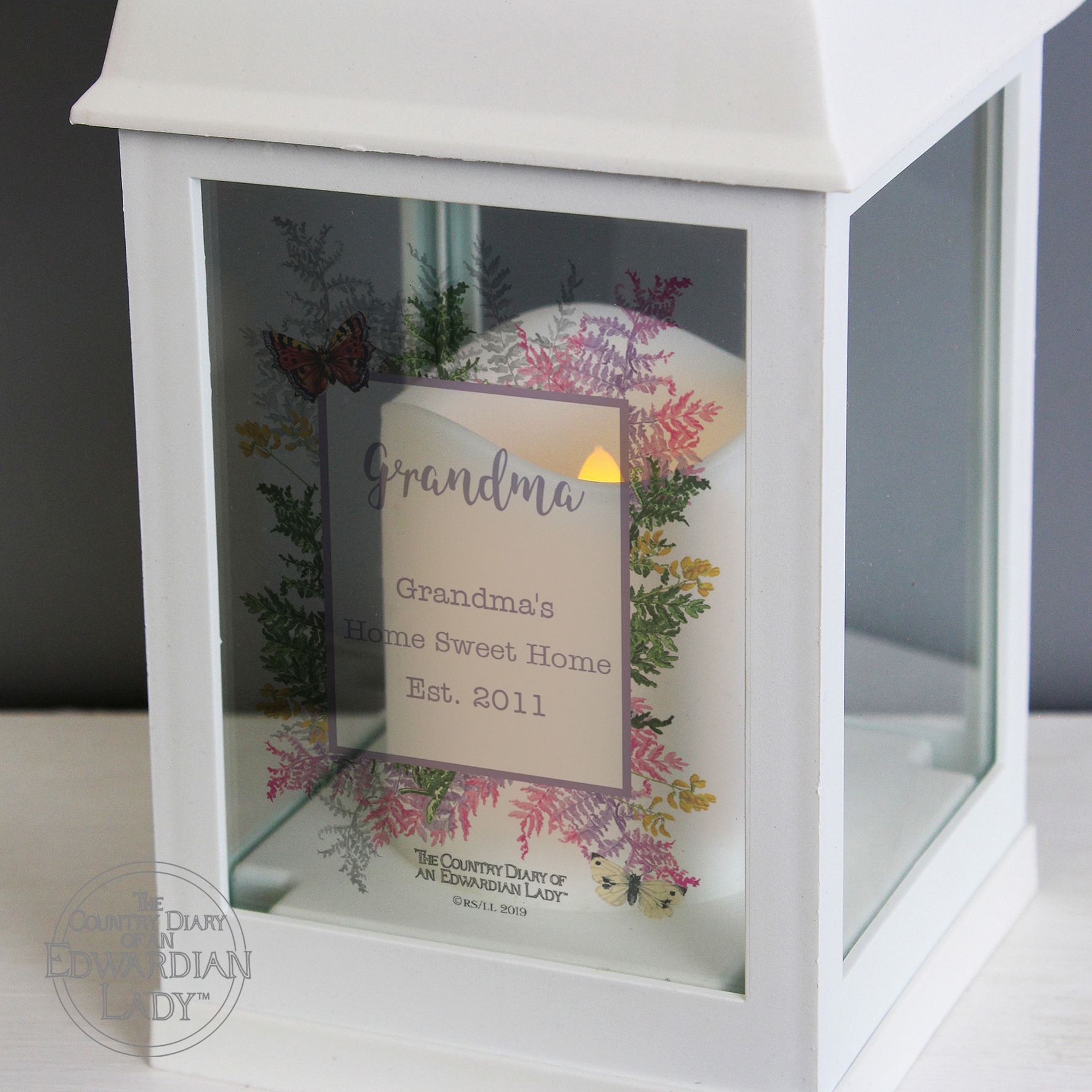 This stunning Personalised Country Diary Botanical White Lantern is an ideal way of adding a stylish touch to any home.This lantern can be personalised with 4 lines of text. Line 1 can be personalised with 12 characters and will appear slightly larger. Lines 2-4 can fit up to 15 characters per line.All text is case sensitive and will appear as entered.Please avoid entering your text in block capitals, as this may make the personalisation difficult to read.The battery-powered lantern has a realistic flickering warm orange flame effect, adding an ambient touch to any room.The lantern is easy to hang around the home with the hoop attached. The lantern can be switched on/off from a switch on the base. Please note that the lantern is supplied without batteries. The lantern requires x3 AAA batteries.This product has a matt plastic finish.Suitable for indoor use only.Ideal for Birthdays, Mother’s Day, For Her.