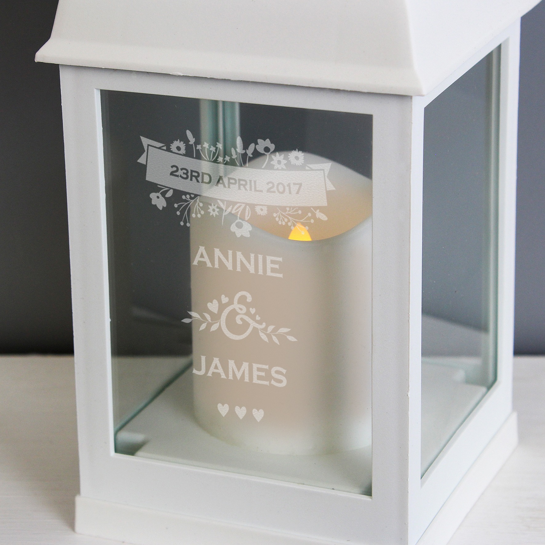 Our Personalised Couple’s Floral White Lantern is perfect for celebrating an anniversary, or as a wedding venue decoration.This lantern can be personalised with a date or message up to 20 characters (in the banner) and 2 names up to 10 characters each. All text entered will appear in upper case. The ‘&’ symbol is fixed.The battery-powered lantern has a realistic flickering warm orange flame effect, adding an ambient touch to any room.The lantern is easy to hang around the home with the hoop attached. The lantern can be switched on/off from a switch on the base. Please note that the lantern is supplied without batteries. The lantern requires x3 AAA batteries.This product has a matt plastic finish.Suitable for indoor use only.Ideal for weddings, anniversaries, engagement parties and Valentine’s day.