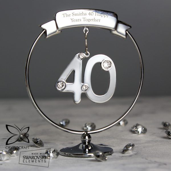 Mark their 40th Birthday or Wedding Anniversary with this elegant Crystocraft ornament. Dangling from a personalised round silver stand ia a crystal clad 40. This will catch the light and bring a smile to the recipients face.You can personalise this ornament with 2 lines of text up to 20 characters per line. All personalisation is case sensitive and will appear as entered.Made with Swarovski elements.This item is silver plated.Ideal for Birthdays and Anniversaries