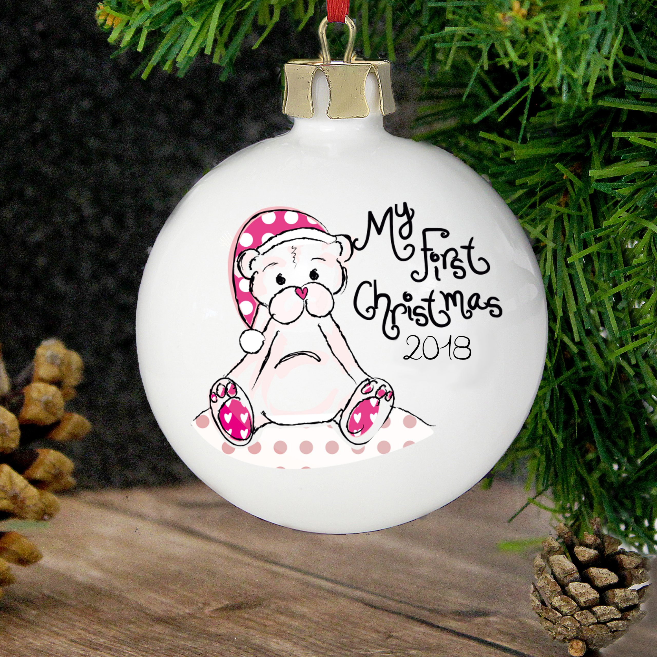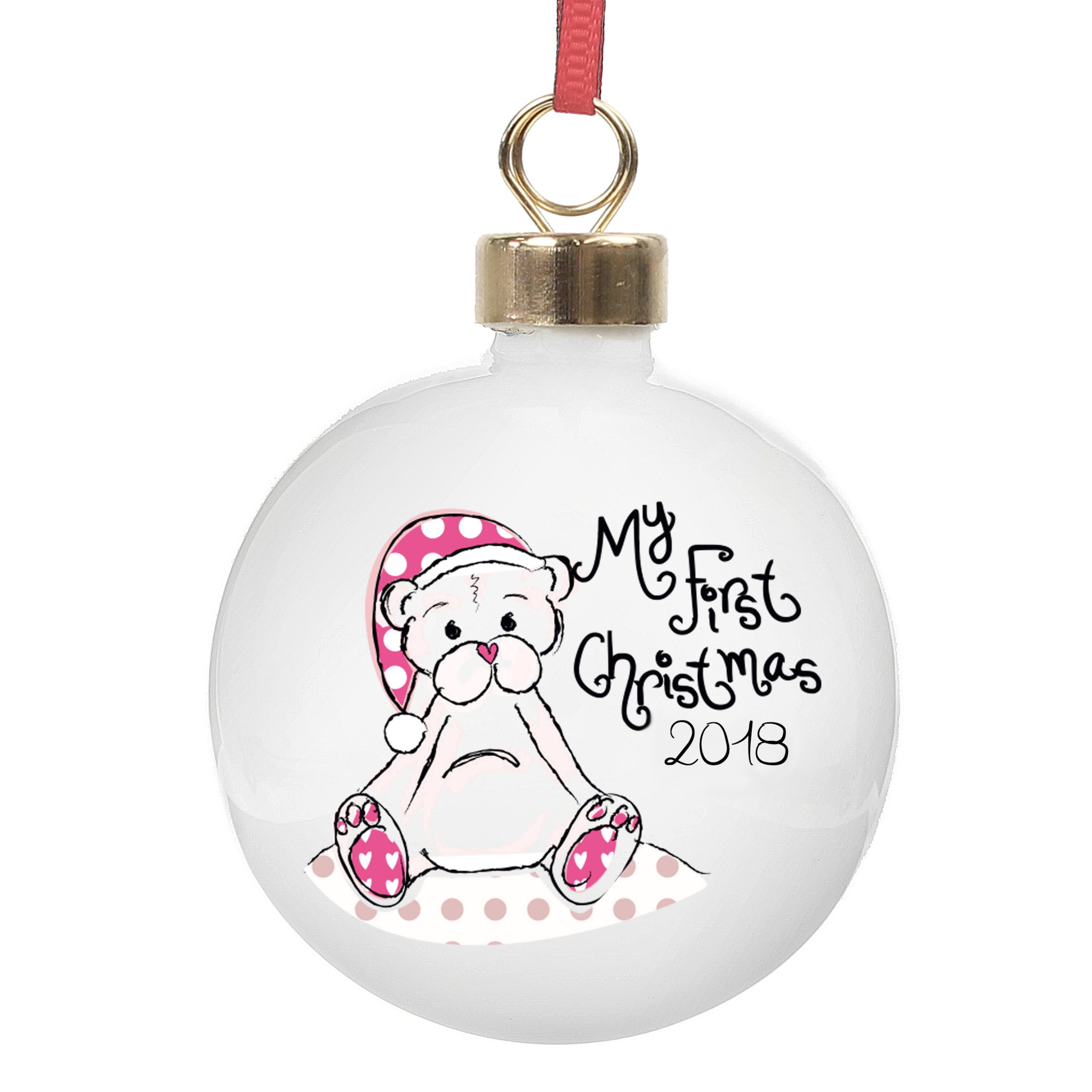 This beautiful ceramic bauble is the perfect way to celebrate a child’s first Christmas. The words “”My First Christmas”” are standard but you can personalise the year on the front and also 4 lines of personalisation on the reverse, 22 characters per line.The style of bauble topper may vary.