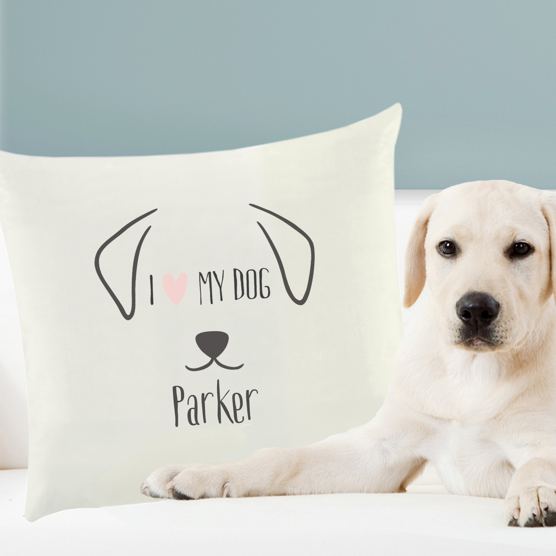 A lovely gift to make sure no one steals their spot on the sofa!The words on this Dog Features Cushion Cover, ‘I (heart symbol) MY DOG’ are fixed. You can then personalise this quirky cushion cover with a name up to 20 characters long. All personalisation is case sensitive and will appear as entered. Cool wash only.Line Dry.Iron on reverse only.The material of this cushion cover is 100% cotton.Cushions are not included.This item is not available next day.Ideal for New Home Gift, Birthday Gifts, For Her Gifts, For Him Gifts, Mother’s Day, Father’s Day, Pet Lovers.