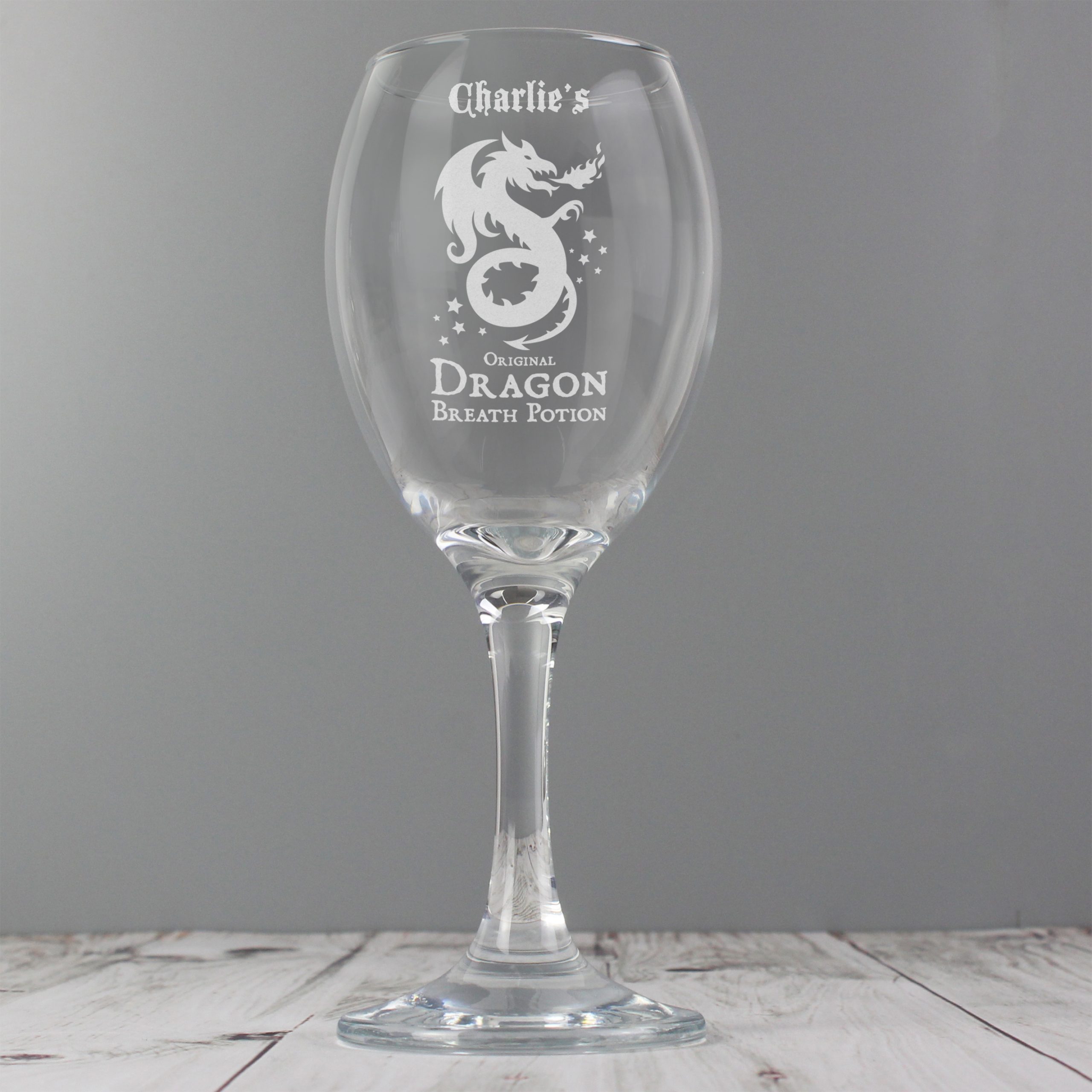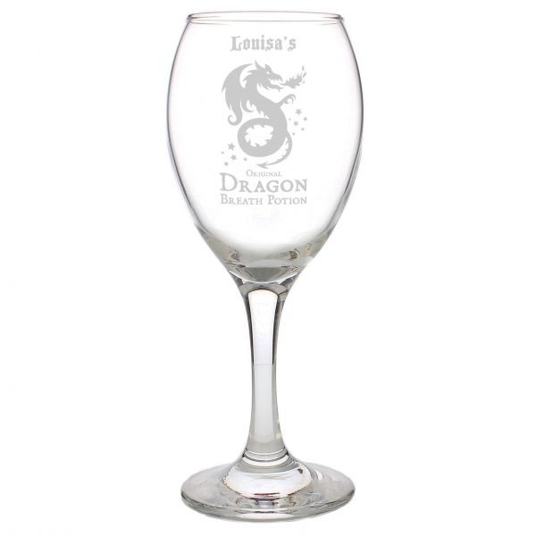 This Personalised Dragon Breath Potion Wine Glass is perfect for a true fan of dragons.The wine glass can be personalised with a name up to 12 characters.Please enter the apostrophe and s (‘s) if required.Please avoid entering the name in block capitals as this may make it difficult to read.The text ‘Original Dragon Breath Potion’ is fixed and cannot be amended. This glass comes presented with a folding gift box. Ideal for Halloween, Birthdays and Christmas.