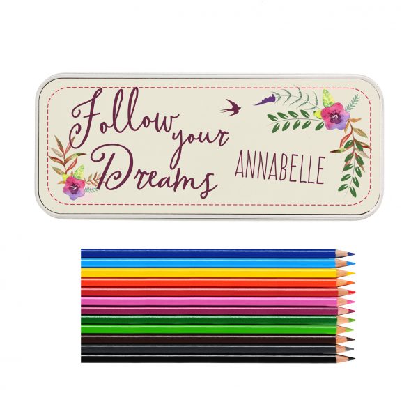 This Follow Your Dreams Pencil Tin with Crayons is an excellent gift for her on any occasion,This pencil tin can be personalised with a name up to 12 characters. Please note that the personalisation will appear in block capitals.’Follow your Dreams’ is fixed text and cannot be amended. What’s more, this pencil tin comes supplied with 12 crayons (these will not be personalised).This pencil tin is made from brushed stainless steel.Ideal for Birthdays, Back to School, Mother’s Day and Christmas.