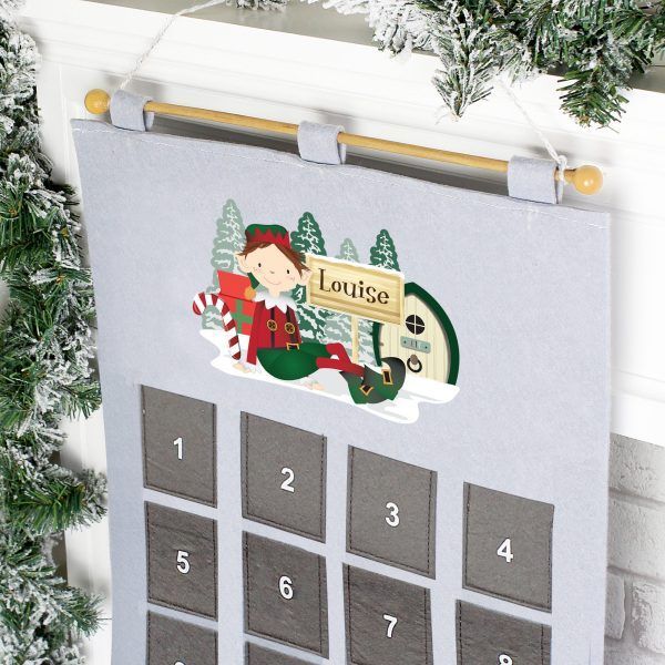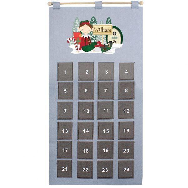 This Christmas elf advent calendar is sure to add anticipation on the lead up to Christmas! The Advent Calendar can be personalised with a name up to 12 characters long.Please avoid entering your text in block capitals as this may result in the personalisation being difficult to read.The advent calendar features 24 numbered pockets that can be used for small sweets or chocolates, allowing the recipient to count down from 1st December to Christmas Eve.Our felt advent calendars are ideal for use year on year and they make an eco-friendly alternative to traditional cardboard advent calendars.To reduce the risk posed by looped cords, cords should be kept out of the reach of children.The individual pockets are approximately (7.5cm x 6.5cm)The pockets all taper from the bottom to the top, the depth at the top is approximately 1.5cmThis item is not a toy, not suitable for under 36 months without adult supervision.Ideal for Christmas