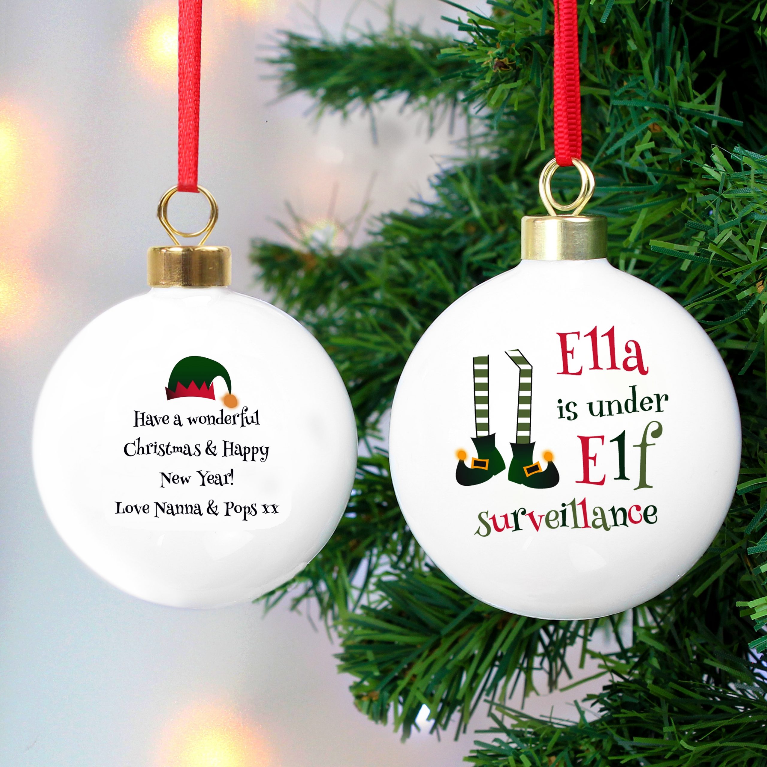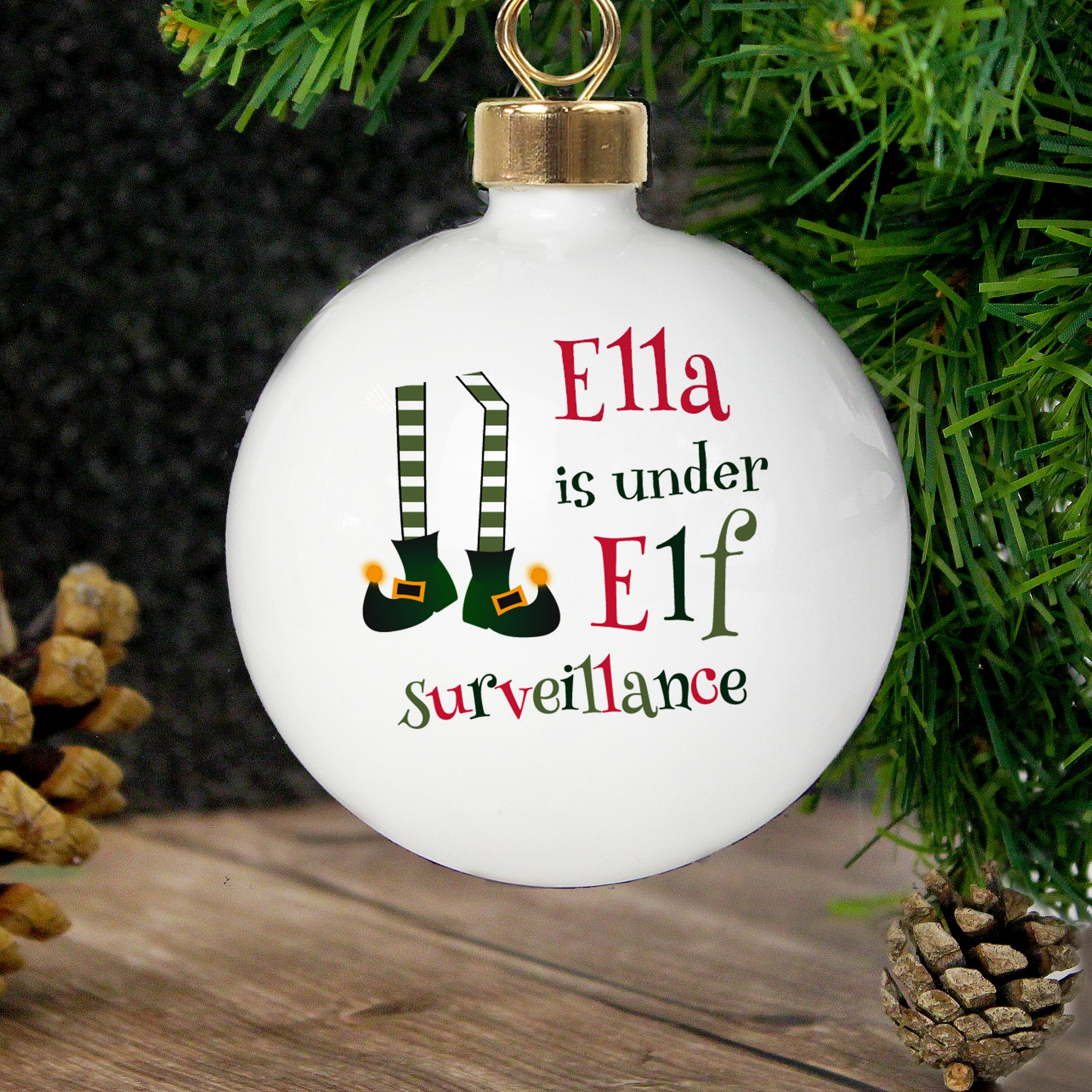 Make sure your children stay on the nice list this Christmas with our Personalised Elf Surveillance Bauble.Personalise this Bauble with a name up to 12 characters and 4 lines on the reverse, 20 characters per line.Please note all personalisation is case sensitive and will appear as requested.The words ‘is under elf surveillance’ are fixed text.The bauble comes supplied with a ribbon ready to hang straight onto the tree. The colour of the ribbon may vary. The style of bauble topper may vary.Great for Christmas!