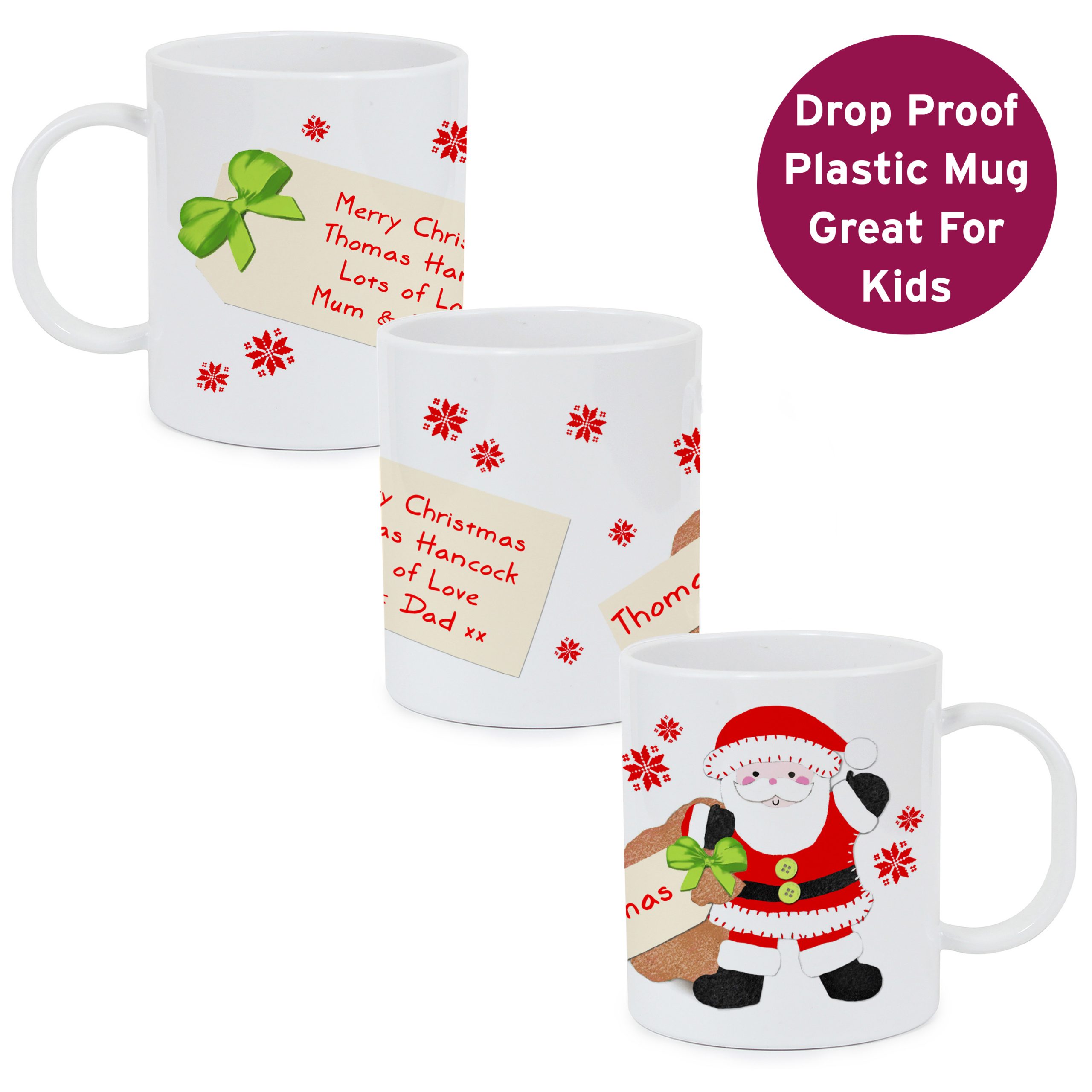 A practical shatter resistant gift for the little ones. Perfect for dinner times!Personalise this plastic Felt Stitch Santa Mug with a name of up to 12 characters on the front, to appear on Santa’s Sack Label. The back of the mug can be personalised with a message of 4 lines of 20 characters each.The mug is plastic and is shatter resistant.NOTE: Due to the font type used please refrain from using all capitals in your personalised message. If the message is all in capitals you will find the personalisation extremely difficult to understand and may even result in personalisation being missed off the product. Many thanks for your cooperation.Ideal for Christmas.