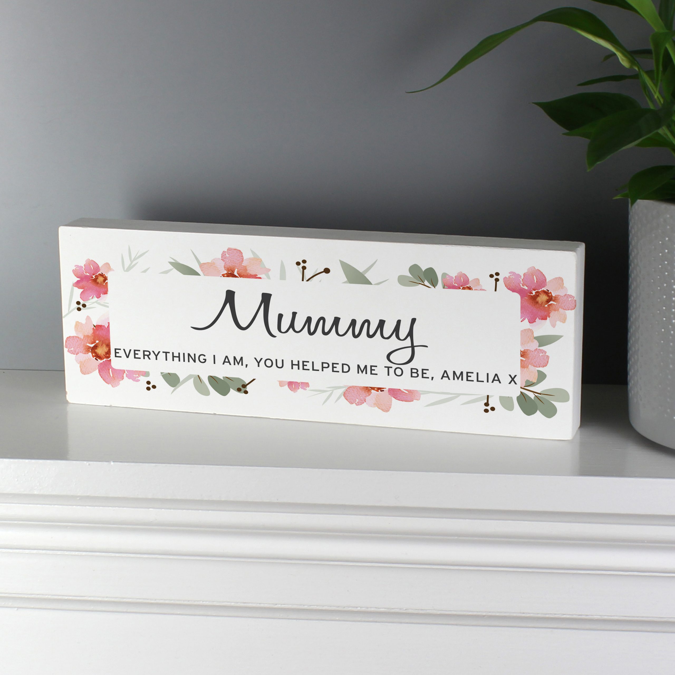 This Floral Wooden Block Sign is the perfect modern gift for any new home.Personalise this sign with:Line 1 (name/role) – up to 12 characters long (please refrain from using block capitals as this may make the personalisation hard to read.)Line 2 (message) – up to 60 characters (fixed upper case)Ideal for placing on a mantelpiece or shelf.Please note that these items are made from solid wood and therefore may contain some imperfections due to their natural material.Ideal for Birthdays, Mother’s Day, New Home.