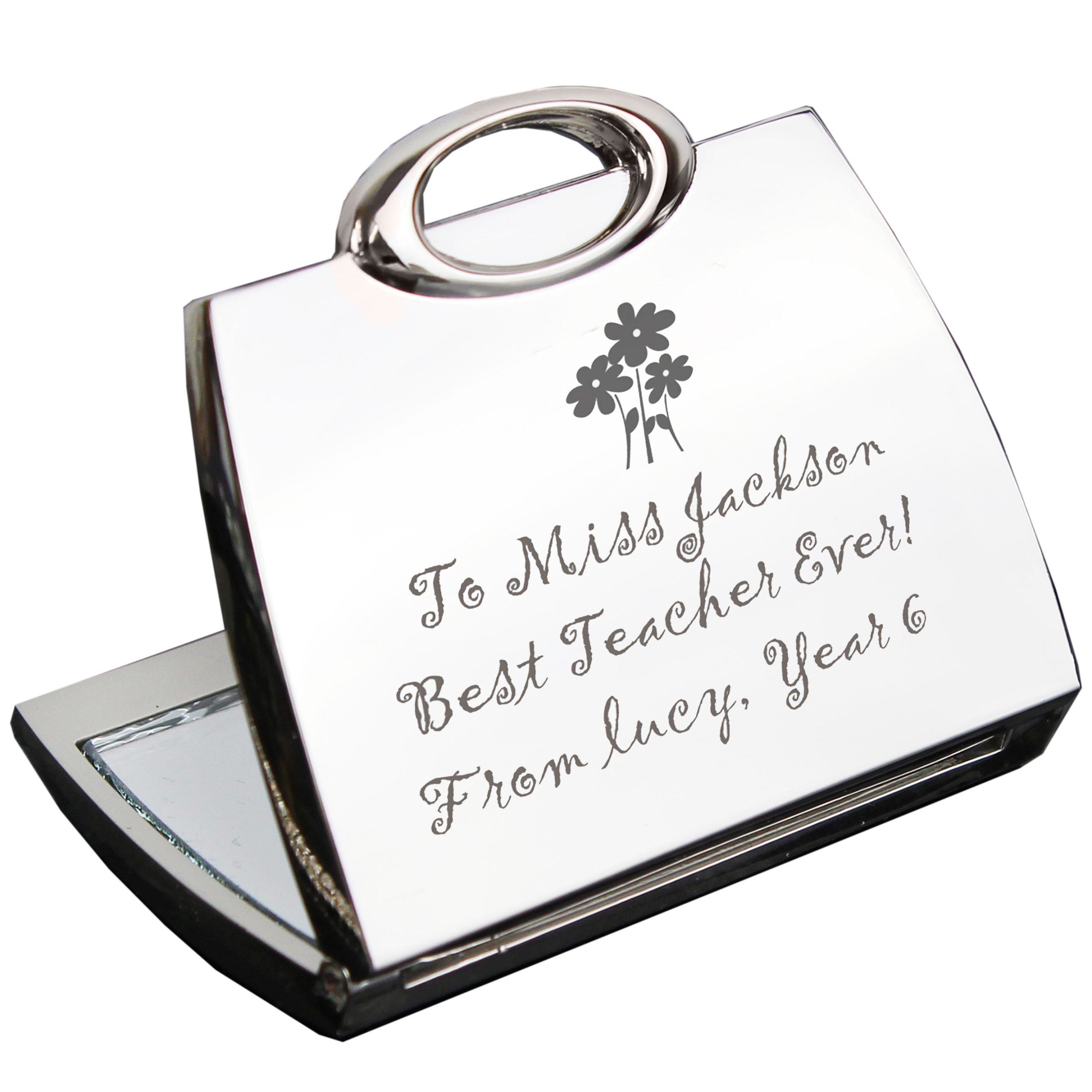 This stunning compact mirror is in the shape of a handbag which features a flower motif and can be personalised with any message up to 3 lines, 20 characters per line.Due to the font type used please refrain from using all capitals in your personalised message. If the message is all in capitals you will find the personalisation extremely difficult to understand and may even result in personalisation being missed off the product. Ideal for Birthday, Mothers Day, school leavers, Teachers