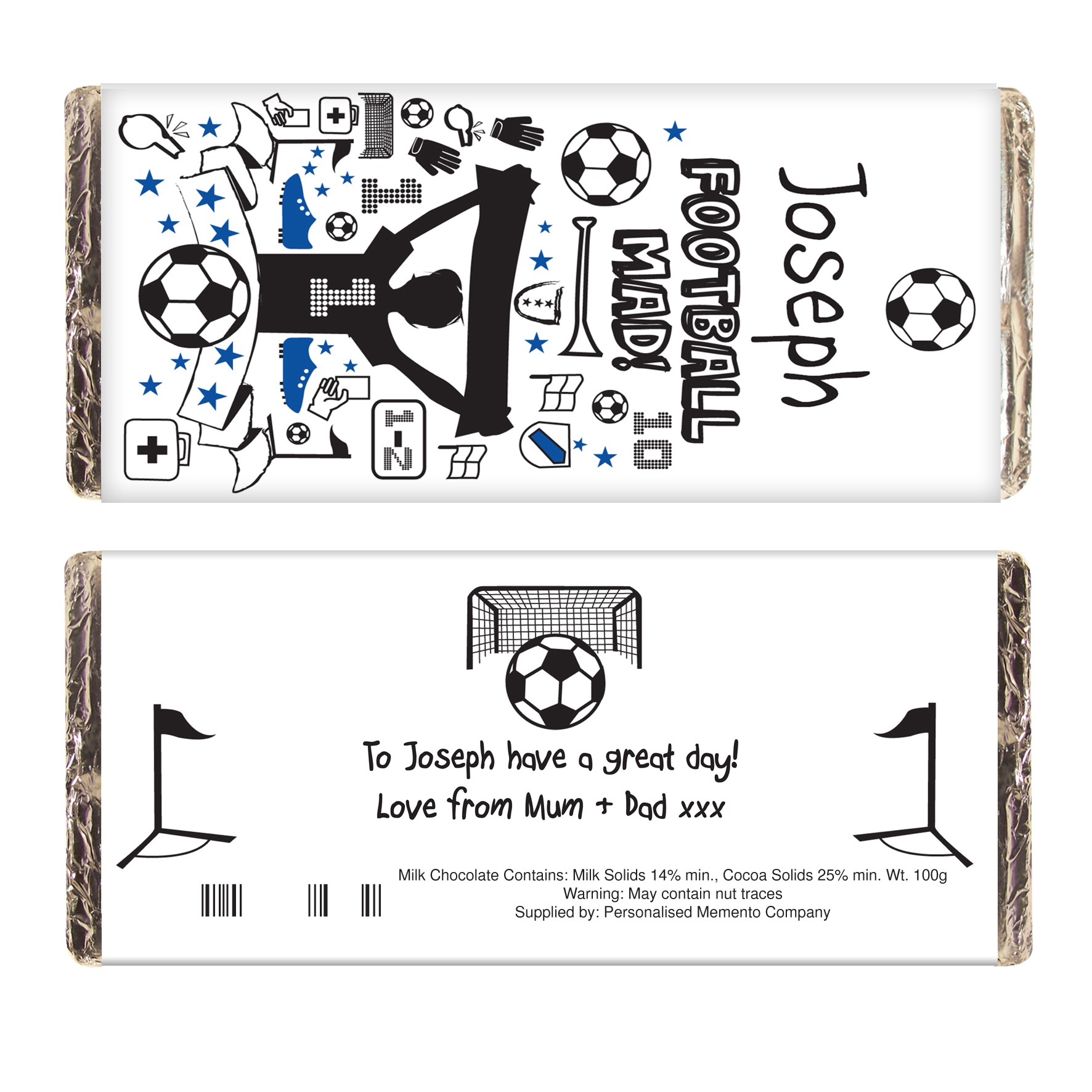 This chocolate bar is the perfect gift for any Football fan!The chocolate bar features football icons which you can personalise with any name up to 12 characters.Add a message to the reverse over 2 lines up to 25 characters per line.Please note ‘Football Mad!’ is fixed text.Milk Chocolate Bar15cm x 7cm x 1cmWeight 100gMay contain traces of nutsOur great value chocolate includes free standard delivery.Due to the nature of this product and the font type used please refrain from using all capitals in your personalised message. If the message is all in capitals you will find the personalisation extremely difficult to understand and may even result in personalisation being missed off the product. Many thanks for your cooperation.