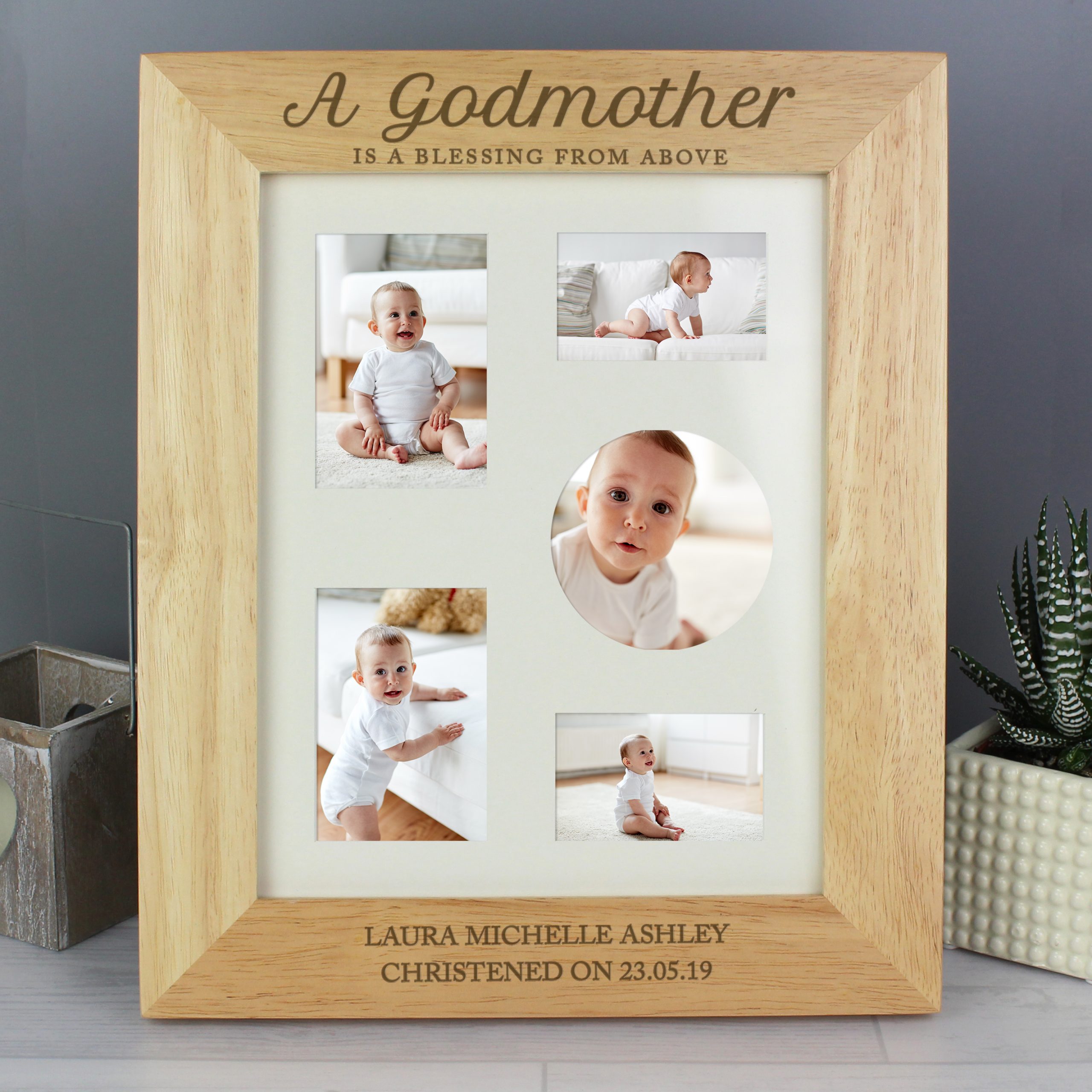 This lovely 8×10 Godmother Wooden Frame is the perfect gift for you special godmother.Personalise the frame with any message over 2 lines of up to 30 characters per line below the photo.Please note the words ‘A Godmother is a blessing from above’ are fixed.All personalisation will appear in fixed uppercase.Frames are made from chinese walnut catalpa wood. Colour of the wood can vary from that shown in the images.The frame can fit 1 8×10 unmounted photo. Alternatively 5 photos can be inserted with the following dimensions.2.5″” x 3.5″”2″” x 3″”70mm round2.5″” x 3.5″”2″” x 3″”Ideal for Christenings and Baptisms