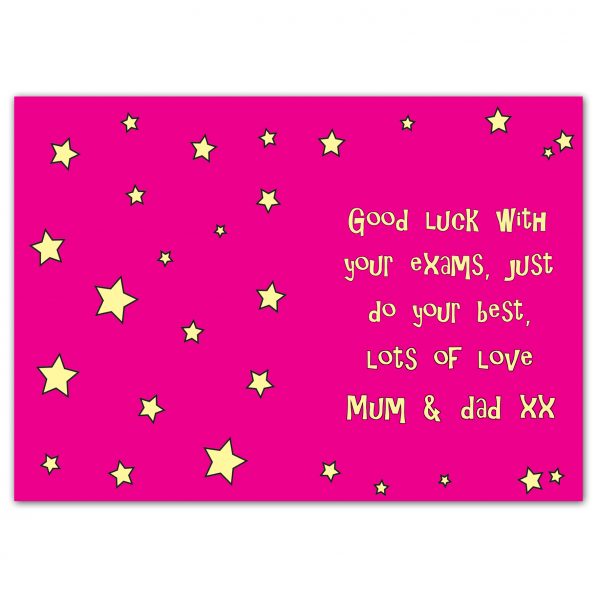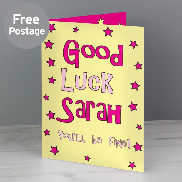 Personalise the front of this card with a name up to 12 characters and a message up to 15 characters, the wording ‘Good Luck’ is fixed text. You can also add a message inside the card over 5 lines and up to 20 characters per line. All Cards come in a brown outer envelope with a Plain White envelope inside. All cards measure 185mm x 132mm.Our great value cards include free standard delivery. Card orders received before 1pm will be dispatched the same working dayIdeal for saying good luck.