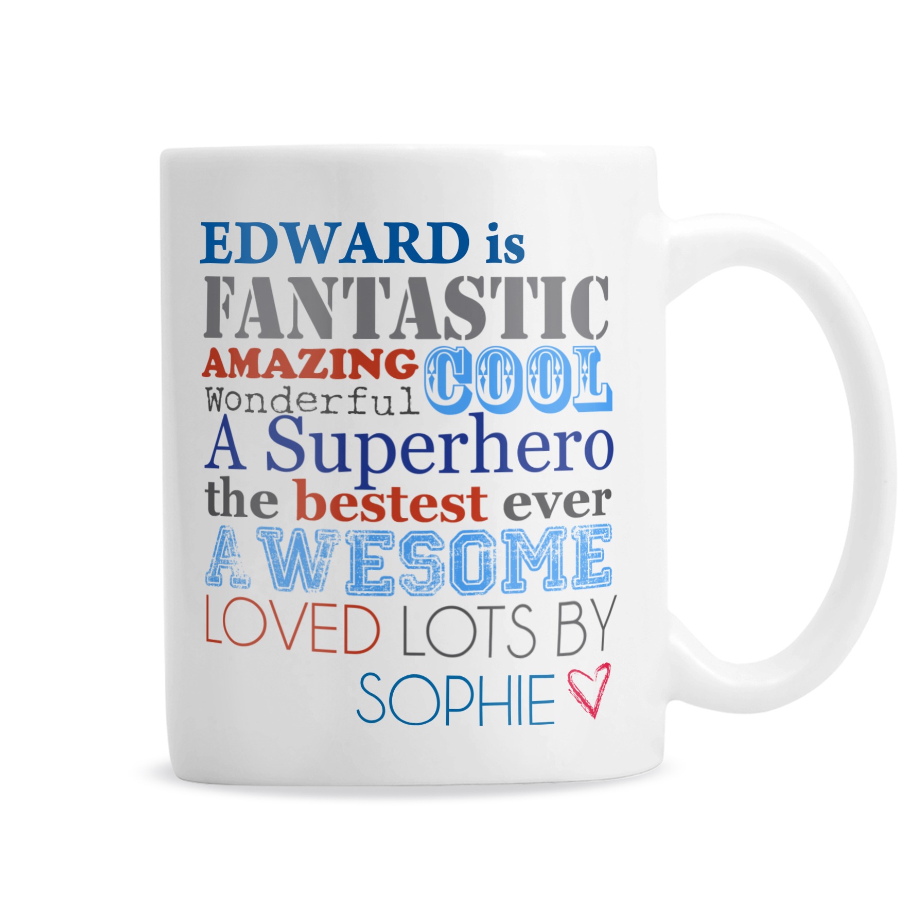 Personalise this ‘He is…’ mug with any name (of the person the gift is too) using up to 12 characters and a line for the name(s) of who the gift is from using up to 20 characters. On the reverse of the mug a longer message over 5 lines of 20 characters can be added.’Is’ , ‘Fantastic,Amazing, Wonderful, Cool, A Superhero, the bestest ever, Awesome’ and ‘Loved Lots By’ is fixed text to the front of the design. All personalisation will appear in uppercase.What’s more, this fantastic gift can also be made and despatched in 48 hours.Hand washing is recommended.Material is ceramic.Ideal for Fathers Day, Birthdays, Christmas.