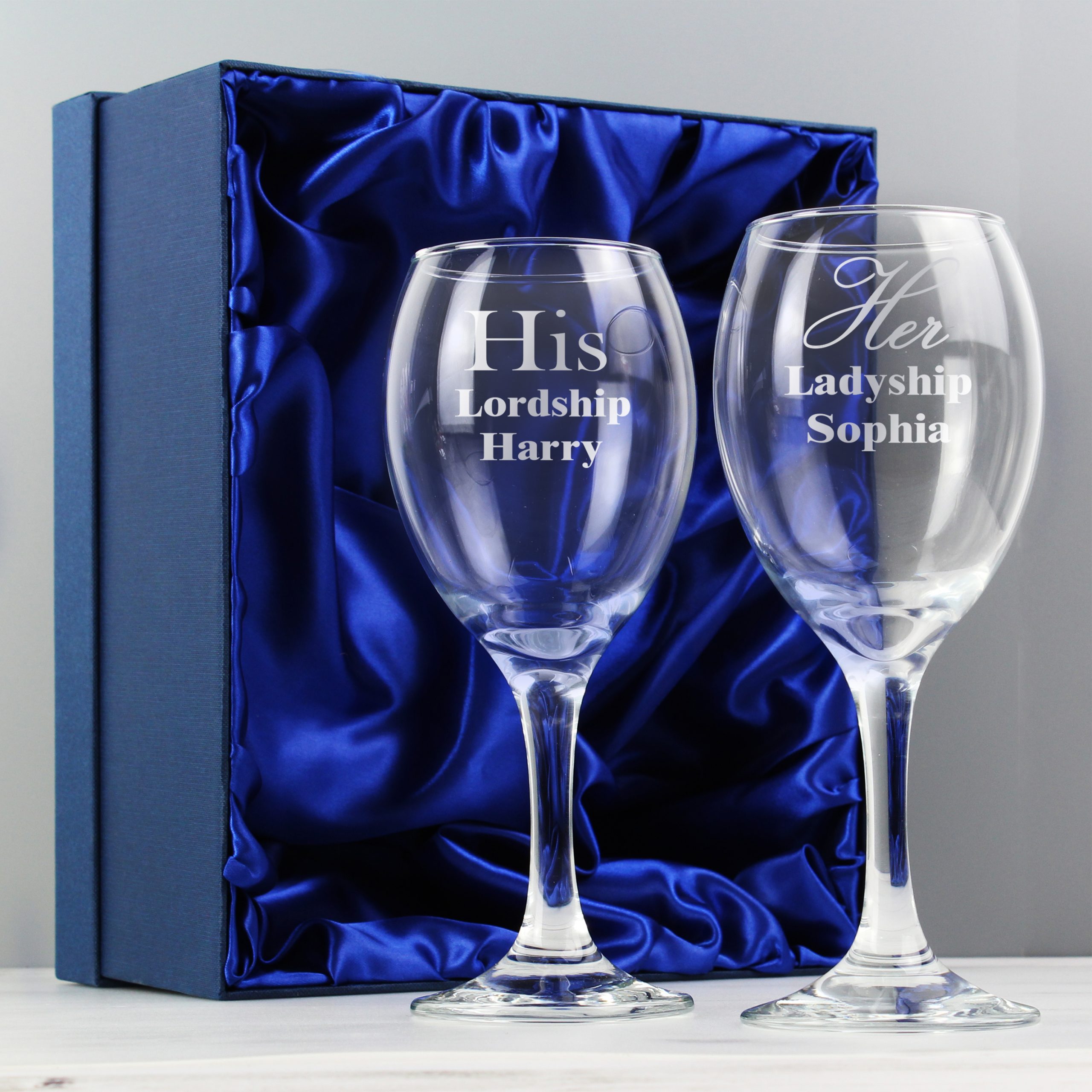 Sharing a glass of wine with your other half is an ideal way to relax after a stressful day! Both of these personalised His & Her Wine Glasses can be personalised with a name up to 12 characters long. Please note that the text His Lordship and Her Ladyship is fixed and cannot be amended.Please note that personalisation is case sensitive and will appear as entered. Please avoid entering your text in block capitals as this may result in the personalisation being difficult to read. The glasses are supplied in a silk lined presentation box. Ideal for Weddings, Anniversaries, Valentine’s, Couples.