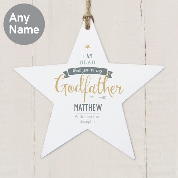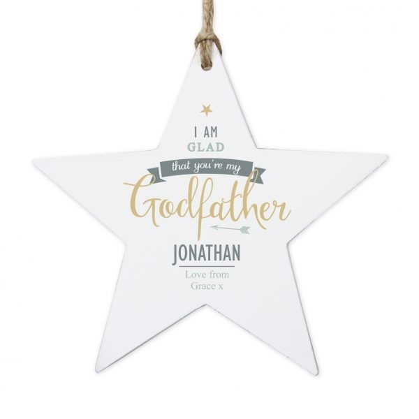 This I Am Glad… Godfather Wooden Star Decoration is a gorgeous gift for any Godfather. It can be hung around the home as a decoration or even used as a unique and thoughtful gift tag. This wooden star decoration can be personalised with a name up to 12 characters and a message over 2 lines with up to 20 characters per line. Please note that the name is case sensitive and will appear as entered, whereas the message below is in block capitals as standard. Please avoid entering your chosen name in block capitals as this may result in the text being difficult to read. The text ‘I am glad that you’re my Godfather’ is fixed and cannot be amended. This decoration is made from lightweight white wood board and is supplied ready to hang straight on to a gift, mantelpiece or tree. Ideal for Christenings and Baptisms.