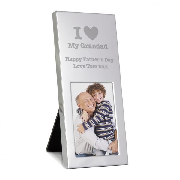 Personalise this I Heart Small Silver Frame with a name or role up to 15 characters and a message over 2 lines, 20 characters per line.’I’ and the heart shape are fixed.Please enter ‘My’ if required i.e. My Daddy.All text is case sensitive and will appear as entered.Holds a print 2″” by 3″”.The Frame has a silver finish.Includes a stand only. Cannot be wall mounted.Perfect for New Births, Christening, Baptism.