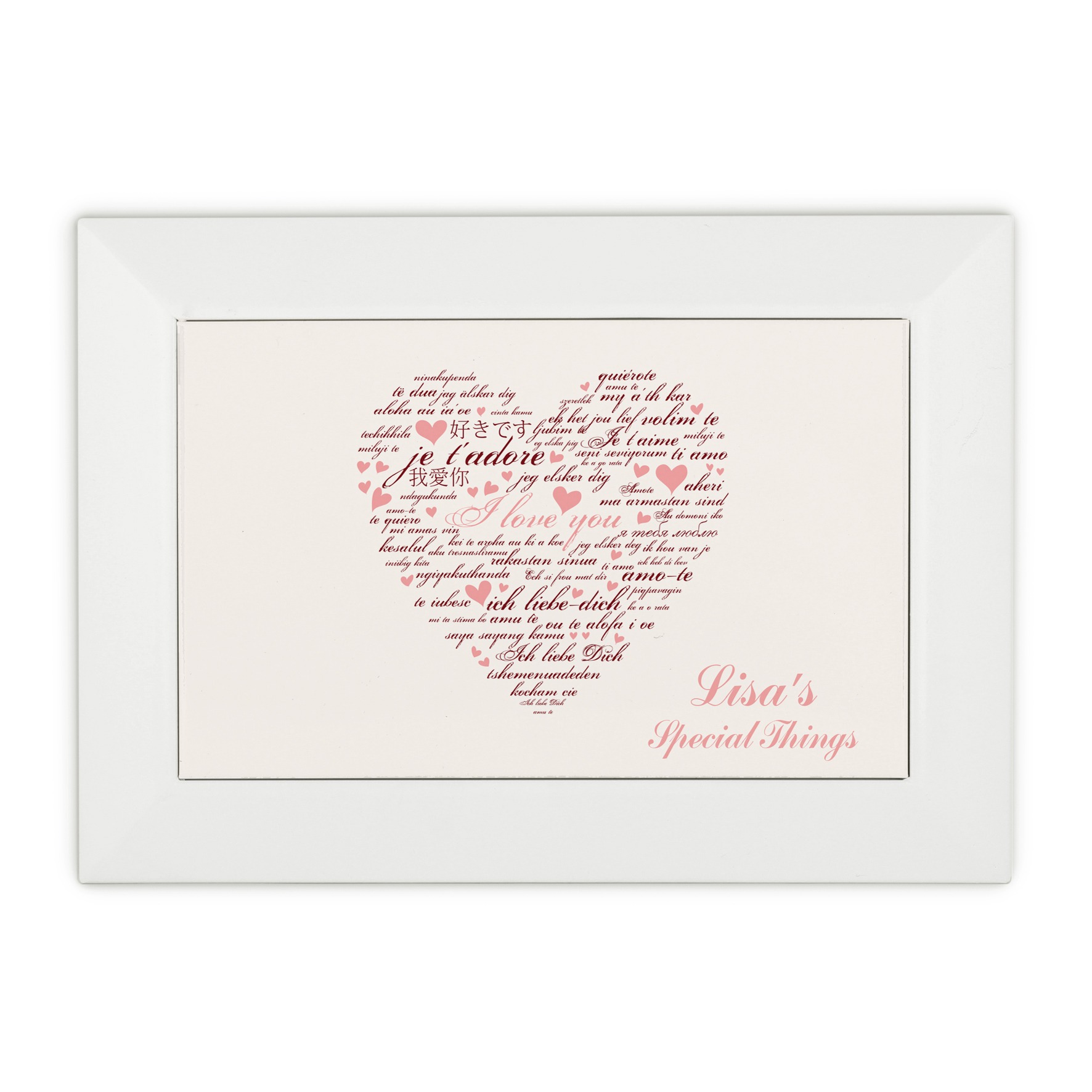 Personalise this I Love You White Jewellery Box with a name up to 12 characters and a date or message up to 15 characters.’I Love You’ and all of the wording in the heart design is standard text.The Wooden Jewellery box has a large compartment with a mirror in the lid.Perfect for Birthday.