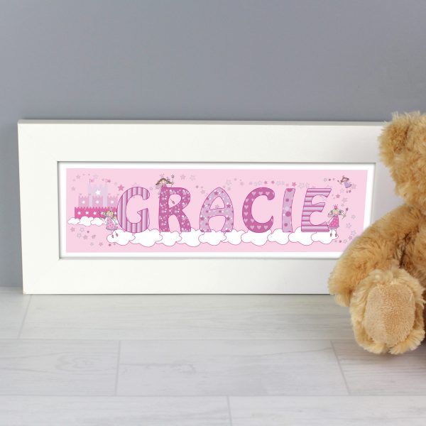 A gorgeous fairy-tale name print beautifully presented in a white wooden frame that measures 35.5cm x 16.5cm approx . The name prints are for first names only with 12 maximum characters.Please note that all text will appear in upper case.
