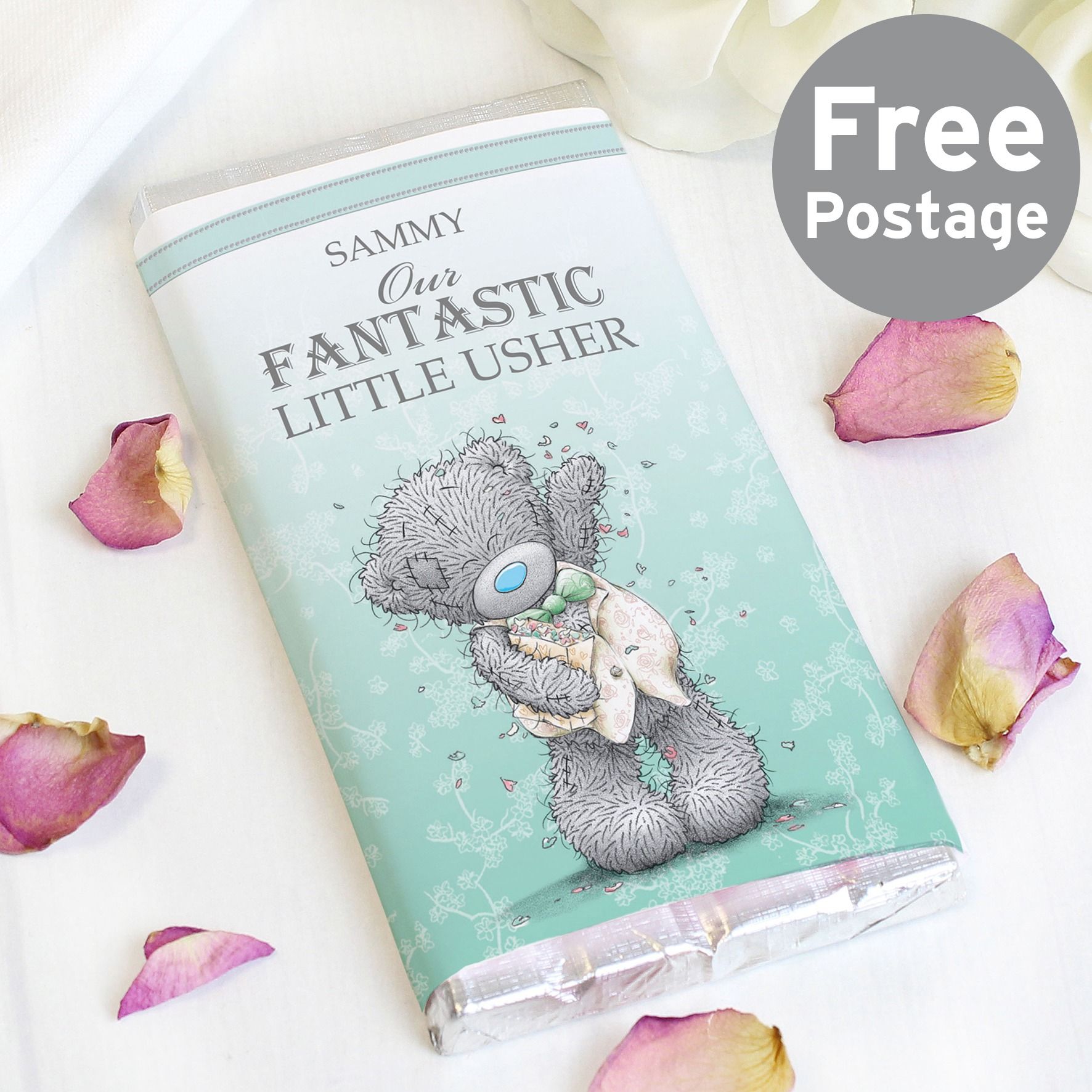 Personalise the front of this “”Me To You”” chocolate bar with a name of up to 12 characters long. “”Our Fantastic”” is fixed text. You can then personalise the last line with a name of up to 15 characters long (Usher, Best Man, Page Boy etc.). On the reverse you can personalise with a message up to four lines of 20 characters per line.The personalisation entered on the front of this chocolate bar will appear in uppercase. All other personalisation on the reverse will appear as entered and is case sensitive.What’s more our great value chocolate includes free standard delivery and is available on a next day.Milk Chocolate Bar15cm x 7cm x 1cmWeight 100gMay contain traces of nutsIdeal for Weddings, Couples, Special Occasions.