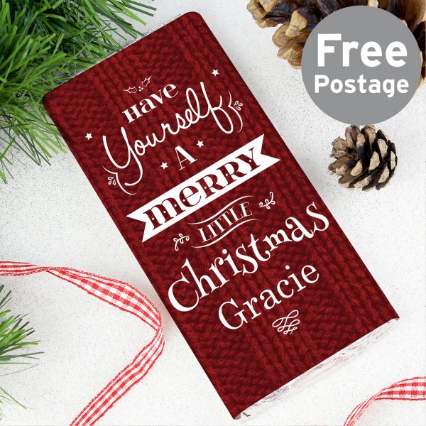 Personalise with a name up to 12 characters and 3 lines of message on the reverse, 20 characters per line.’Have Yourself a Merry Little Christmas’ is fixed.Milk Chocolate Bar15cm x 7cm x 1cmWeight 100gMay contain traces of nutsOur great value chocolate includes free standard delivery. Great for Christmas!