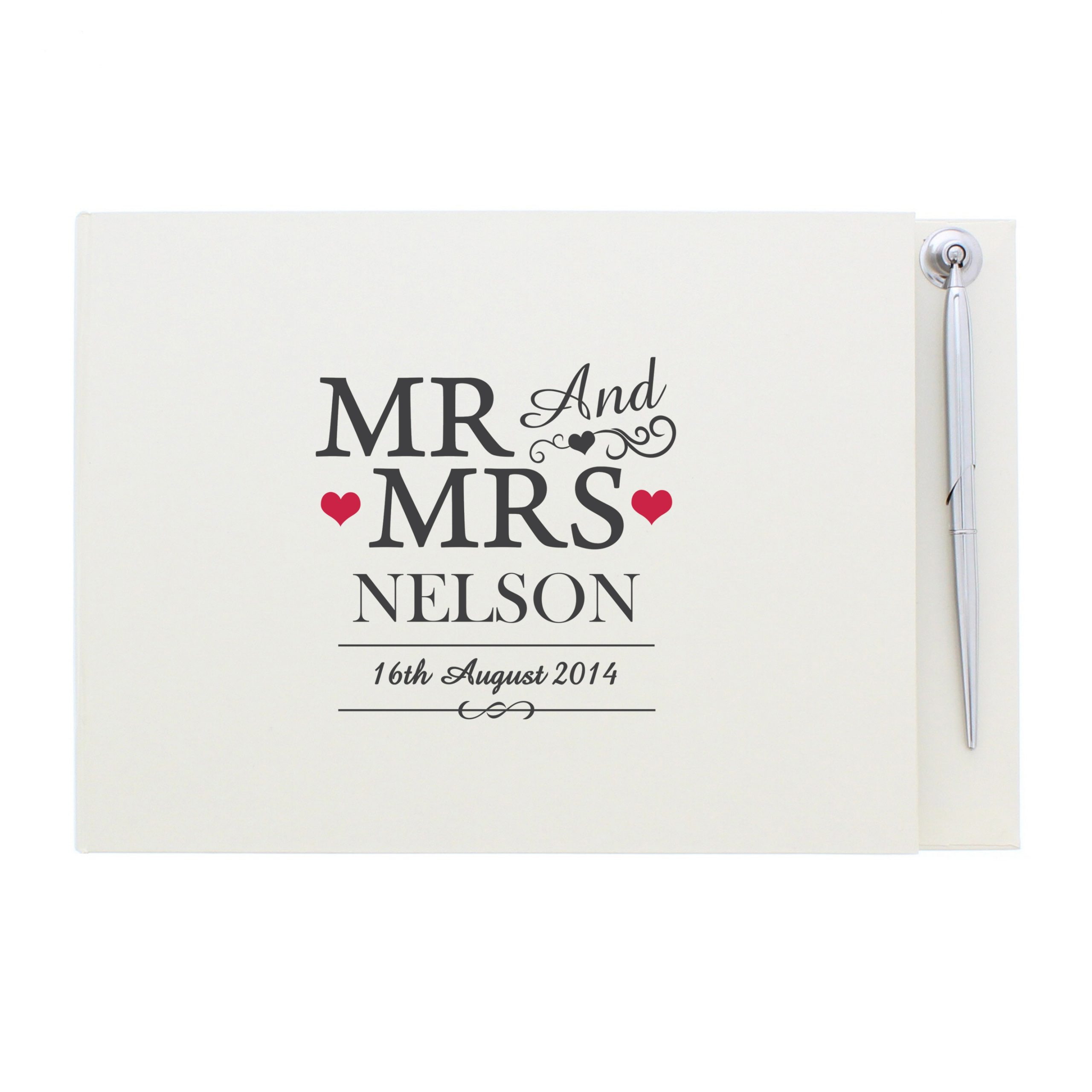 The words ‘Mr and Mrs’ are fixed. You can then personalise this Mr & Mrs Guest Book and Pen with the couples surname up to 15 characters and a date up to 20 characters in length. The Surname will appear capitalised as standard.NOTE: Due to the font type used please refrain from using all capitals in your personalised message on line 2. If the message is all in capitals you will find the personalisation extremely difficult to understand and may even result in personalisation being missed off the product. Many thanks for your cooperation.Perfect for Wedding, Anniversary.There are approximately 30 sheets of high quality paper inside and the pen is a ball point.