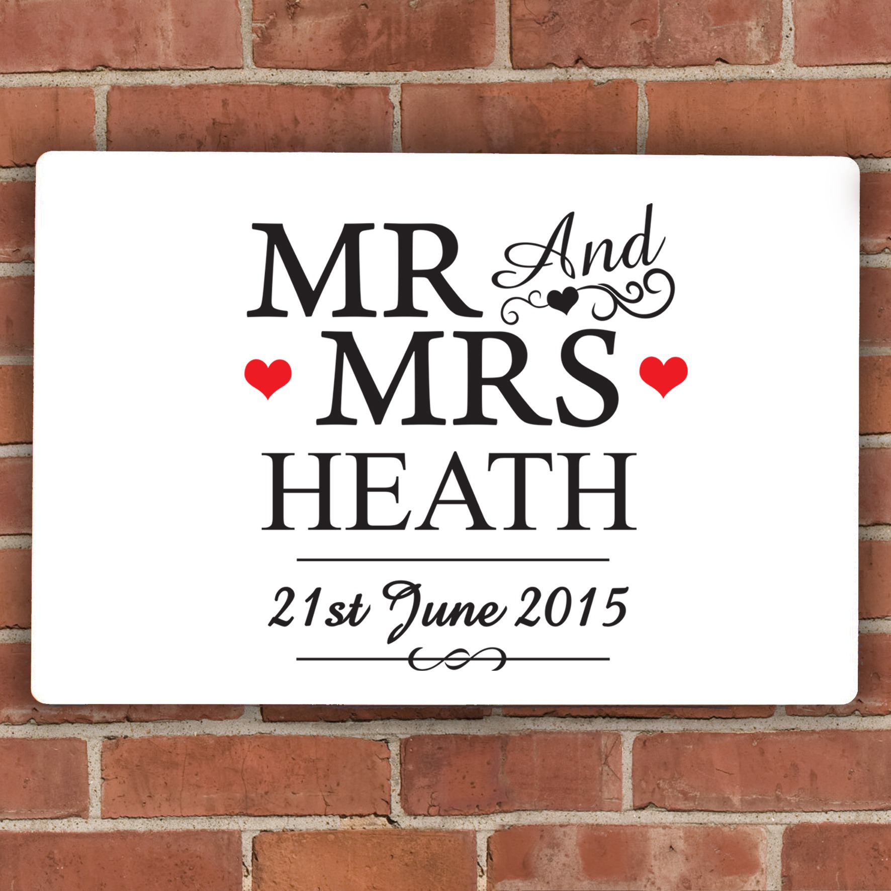 Personalise this Mr & Mrs Plaque with a surname using up to 12 characters and a date up to 20 characters long.’Mr And Mrs’ is fixedLine 1 will appear in UPPER CASEThis Decorative Wedding Mr & Mrs Plaque is made from aluminium.This product is not available next day.Ideal for Wedding Gift, Wedding Reception.