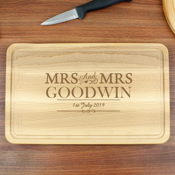 Personalise this Mrs & Mrs Chopping Board with a couples surname up to 15 characters and date up to 20 characters.’Mrs & Mrs’ is fixed.Surname will appear exactly how customer enters.If you would like the personalisation to be formatted like the image please enter Line 1 in uppercase and Line 2 in proper case e.g. Line 1 (Surname) – SMITHLine 2 (Date) – 13th June 2015Please note as the chopping board is a natural wood product, colour and grain may vary from board to board. This may also cause the engraving to appear slightly darker or lighter in places, however the surface should be smooth and even.NOTE: Due to the font type used please refrain from using all capitals in your personalised message on Line 2 (date). If the message is all in capitals you will find the personalisation extremely difficult to understand and may even result in personalisation being missed off the product. Many thanks for your cooperation.Perfect for Wedding, Anniversary