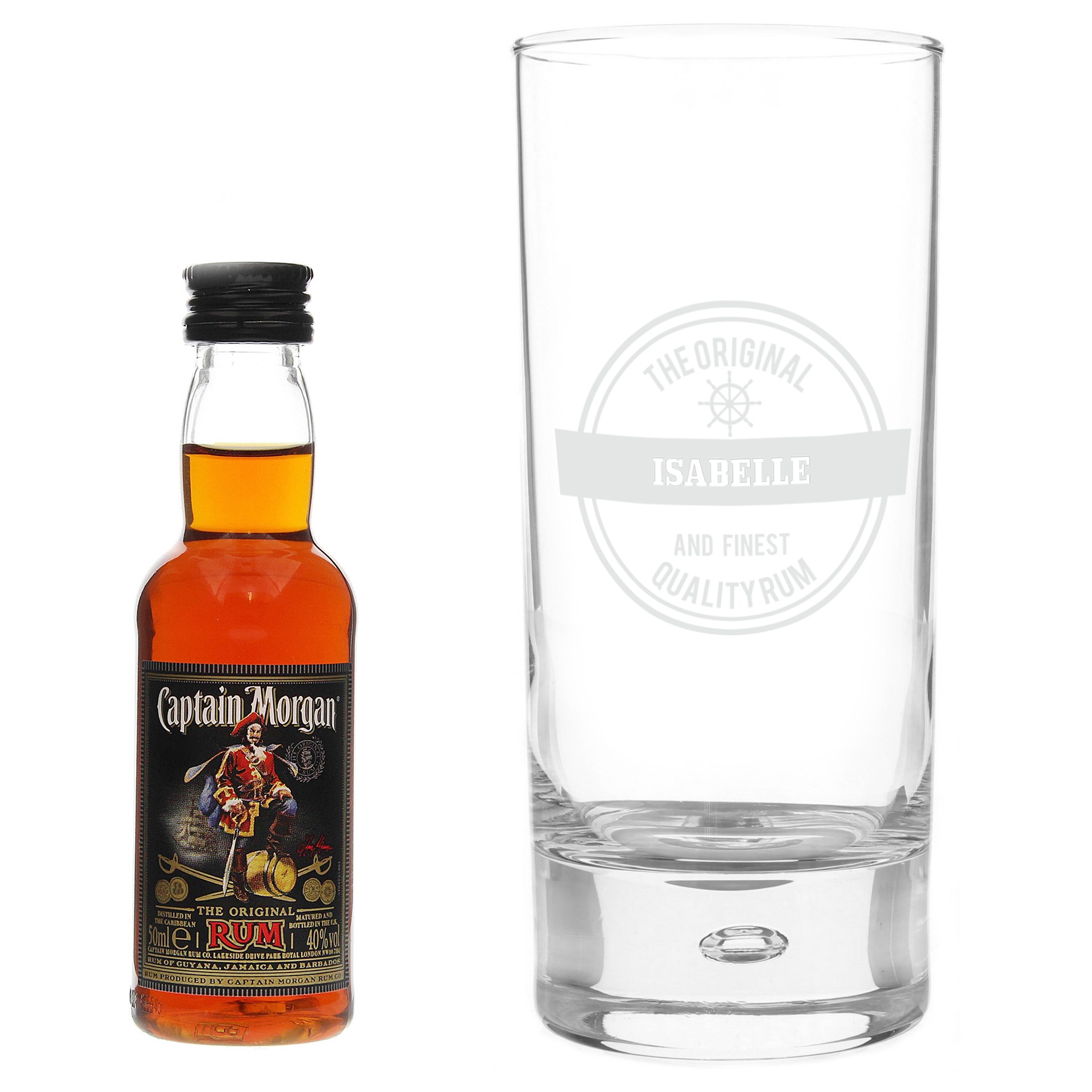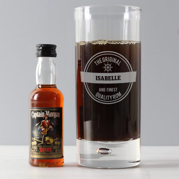 A special treat for any fan of Rum!This Nautical Hi Ball & Rum Miniature set can be personalised with a name to 15 characters in length. Please note that the text ‘The Original’ & ‘And Finest Quality Rum’ is fixed text and cannot be altered. Please note that all text is case sensitive and will appear exactly as entered. Please note the brand of miniature may vary.Please also note that we cannot ship this item internationally. Ideal for Birthdays, Father’s Day, Mother’s Day, Christmas. Captain Morgan Rum Miniature 5cl 40% volGlass is presented in a folding gift box