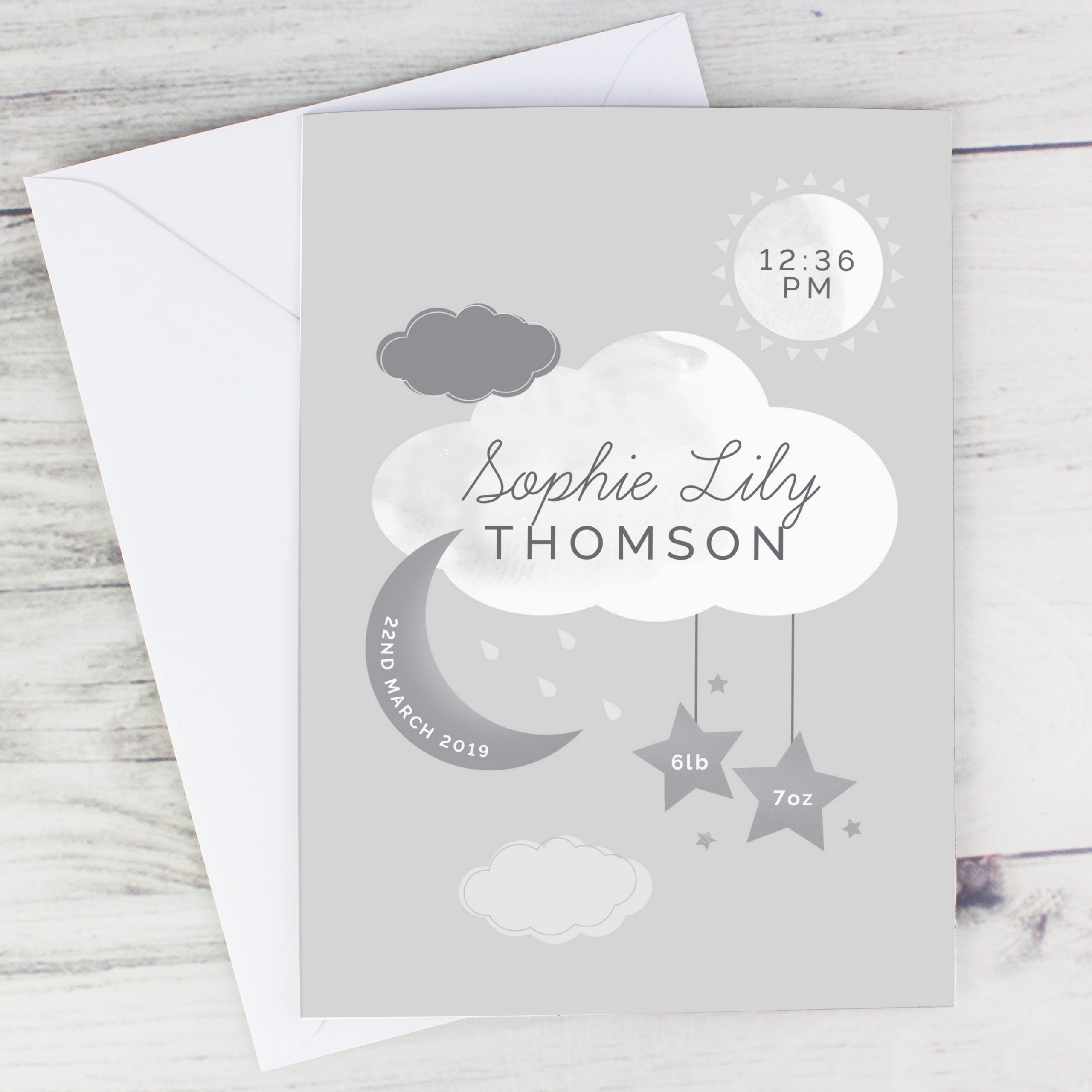 This gorgeous Personalised New Baby Card is a fantastic way of welcoming a little one into the world.The front of this card can be personalised with:Time – 5 Characters (on sun) Fixed upper case.AM or PM – 5 Characters (on sun) Fixed upper case.Name 1 – 12 characters (on cloud) Case sensitive.Name 2 – 12 characters (on cloud) Fixed upper case.Date – 20 characters (on moon) Fixed upper case.Weight 1 – 4 characters (on left star) Case sensitive.Weight 2 – 4 characters (on right star) Case sensitive.The inside of the card can be personalised with 5 lines of text, with up to 25 characters per line. This will appear in fixed upper case.Please avoid entering case sensitive text in block capitals as this may result in the personalisation being difficult to read.All cards come in a brown outer envelope with a plain white envelope inside. Our cards measure 185mm x 132mm.Our great value cards include free standard delivery.Card orders received before 1pm will be dispatched the same working day.Ideal for Naming Day, New-borns, Christenings.