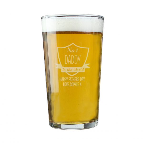 Personalise this No.1 Shield Pint glass with a name/role up to 7 characters, and 2 lines of 20 characters for a message at the bottom. All text will be fixed UPPERCASE.’No1′ and ‘in the world’ is fixed textGreat for Fathers Day, Birthdays.