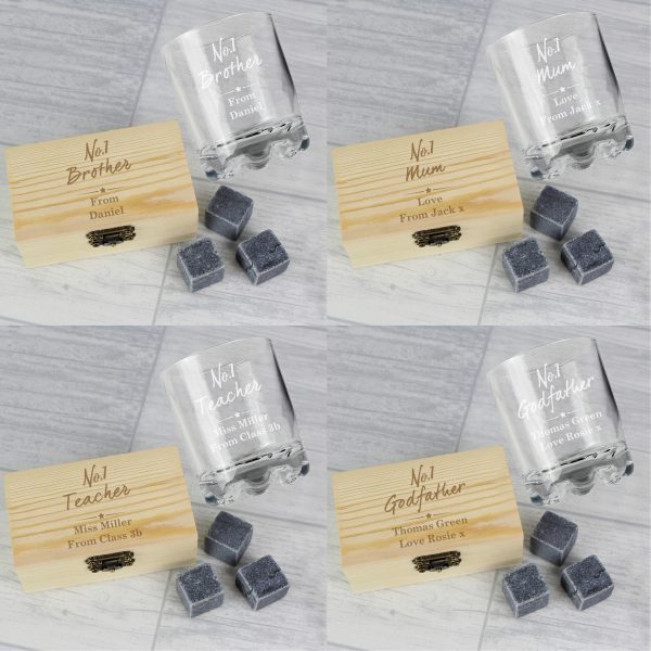 This personalised Whisky Stones and Glass set makes a great gift for any whisky enthusiast. Meaning they can enjoy their drink without watering it down savouring every last drop, the first is always as good as the last!These whisky stones are great for cooling drinks down as they stay cooler for longer with better heat retention and can be used for any alcoholic tipple.Personalise this box and glass with the following.Please note ‘No.1’ is fixed text and cannot be changed.Lines 1 – Up to 12 characters long (Please refrain from using block capitals as this may make the personalisation hard to read.)Lines 2 – Up to 15 characters long (Text will appear as entered)Lines 2 – Up to 15 characters long (Text will appear as entered)Neatly presented in a wooden clasp locked box.Suitable for Freezing.Hand wash the stones after useRounded edges to avoid glass scratches.Hand wash glass only.Perfect for: Birthdays, Father’s day, Weddings.