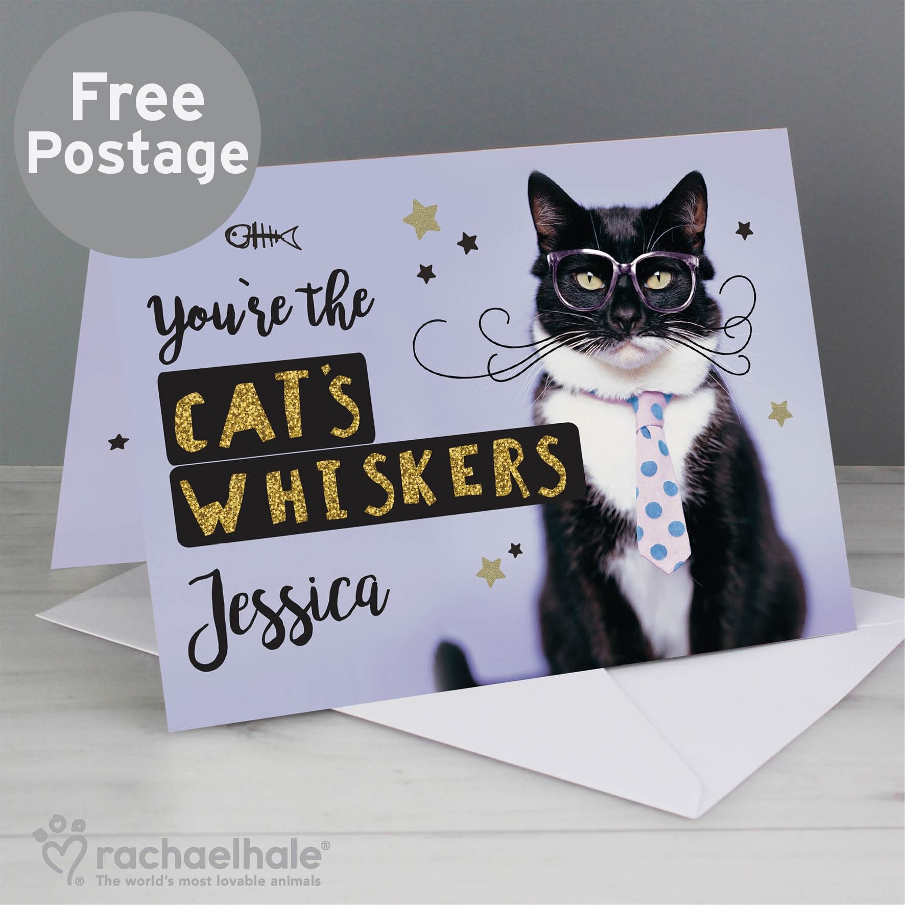 This personalised Rachael Hale ‘You’re the cat’s whiskers’ card is a unique gift for cat lovers.The front of this card can be personalised any name up to 12 characters.’You’re the cat’s whiskers’ is fixed text.The inside of this card can be personalised with 5 lines of text, with up to 25 characters per line.All text is case sensitive and will appear as entered. Please avoid entering your text in block capitals, as this may make the personalisation difficult to read.All cards come in a brown outer envelope with a plain white envelope inside. Our cards measure 185mm x 132mm.Our great value cards include free standard delivery.Card orders received before 1pm will be dispatched the same working day.Ideal for Valentines, Birthdays, Anniversary.