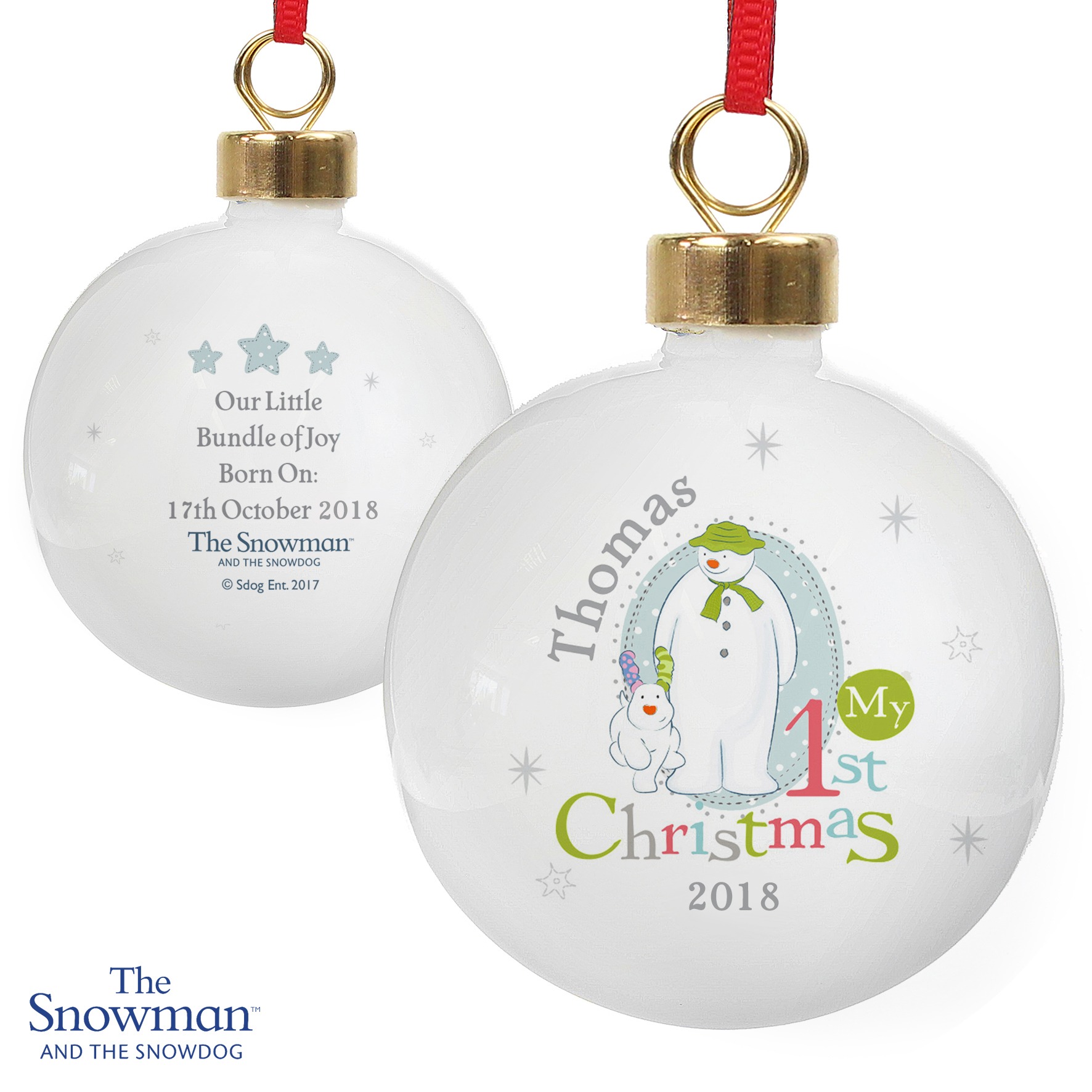 No 1st Christmas would be complete without The Snowman and the Snowdog! This stunning bauble can be perrsonalised with a name up to 12 characters, a year and a message on the reverse over 4 lines of text, with up to 20 characters per line. Please note that all personalisation is case sensitive and will appear as entered. For best results, please avoid entering your text in block capitals as this may make the personalisation difficult to read.The bauble comes supplied with ribbon, ready to hang on a tree or around the home.The style of bauble topper may vary.Ideal for Christmas.