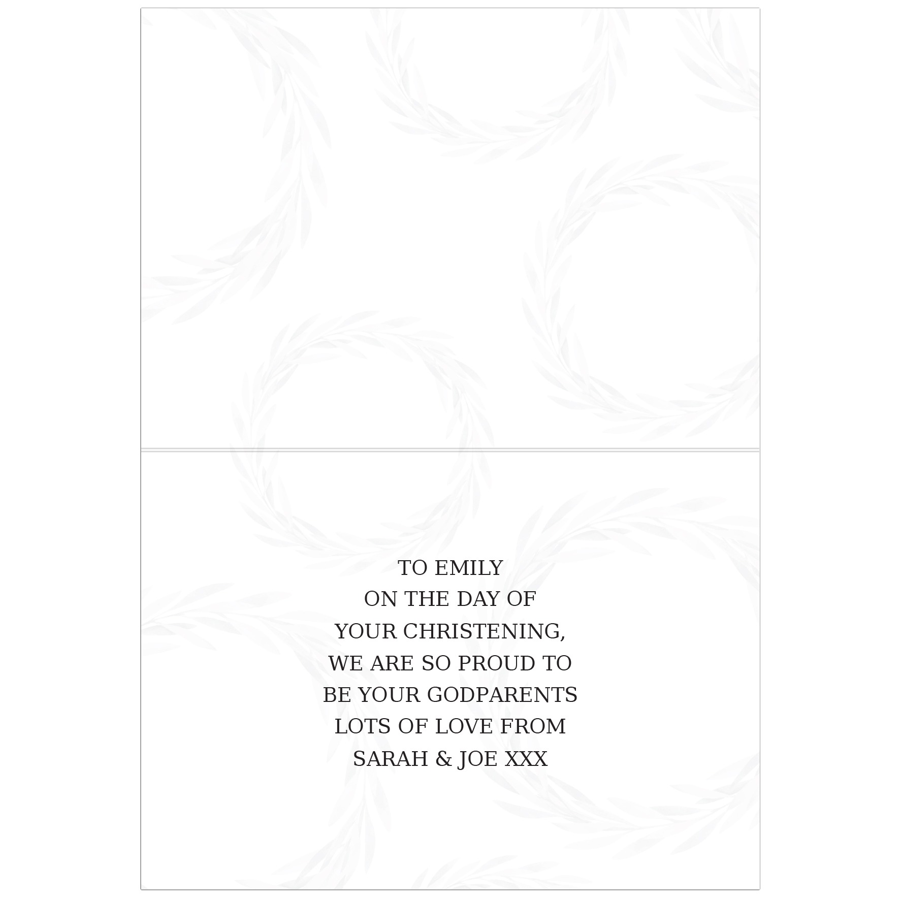 This beautiful Personalised Card is ideal for ChristeningsPersonalise the front of this card with any name up to 20 characters. The inside of this card can be personalised with up to 7 lines, 25 characters per line.The name on the front will appear in fixed uppercase. “”On your Christening”” & “”You are truly blessed”” is fixed text. All Cards come in a brown outer envelope with a Plain White envelope inside.All cards measure 185mm x 132mm.Our great value cards include free standard delivery.Card orders received before 1pm will be dispatched the same working day.Ideal for Christenings