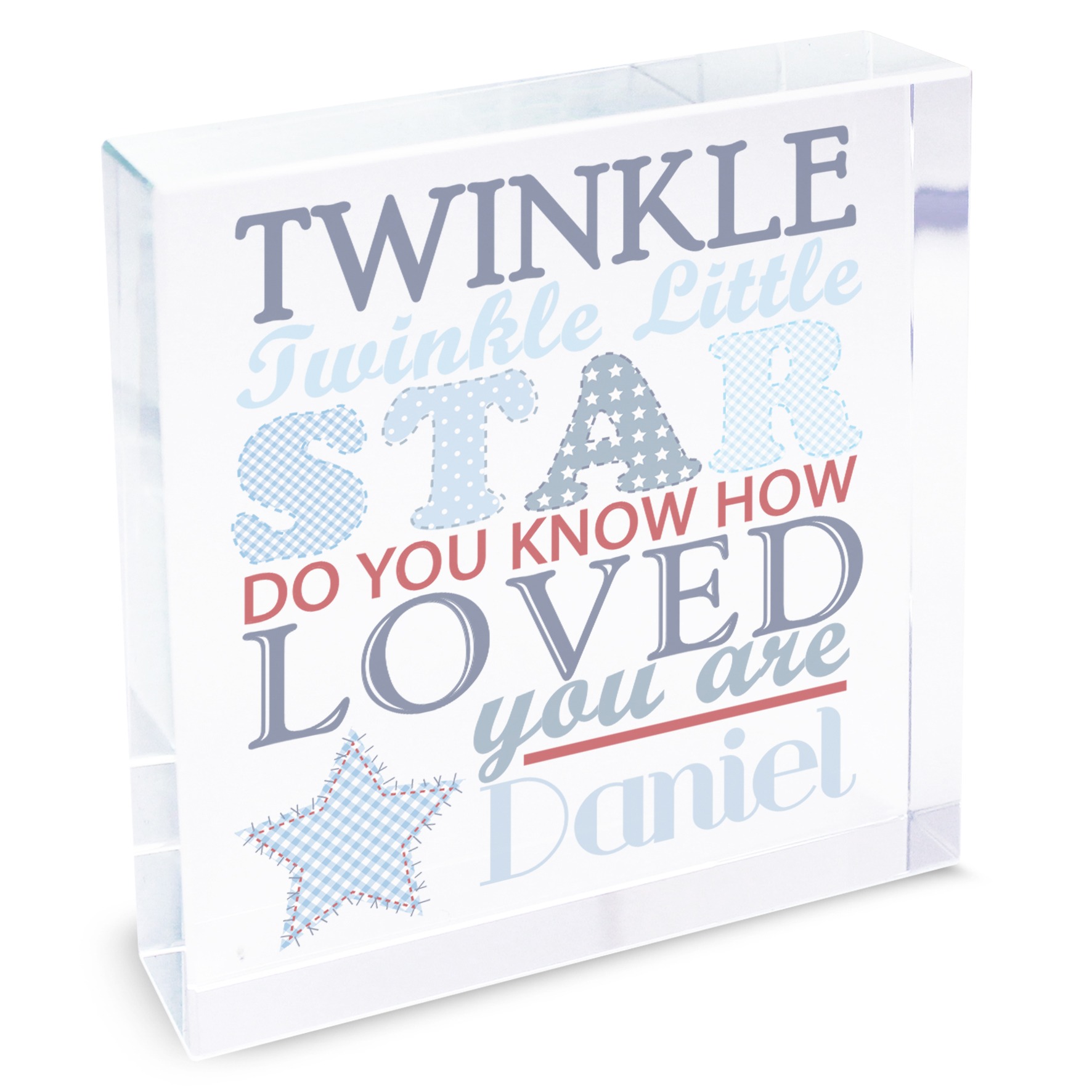 Personalise this Twinkle Boys Large Crystal Token with a name up to 12 characters.’Twinkle twinkle little star do you know how loved you are’ is fixed text.Using the very latest technology, crystal memories are stunning keepsakes which add a touch of class to any room.Comes presented in a black gift box.Due to the nature of this product and the font type used please refrain from using all capitals in your personalised message. If the message is all in capitals you will find the personalisation extremely difficult to understand and may even result in personalisation being missed off the product. Many thanks for your cooperation.Ideal for Births and Christenings.