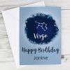 This lovely Personalised Zodiac Virgo Card is a unique way to celebrate that special Birthday.Personalise the front of this card with any name up to 20 characters.The inside of this card can be personalised with up to 5 lines of text, with a maximum of 25 characters per line.On the front of this card the words ‘Happy Birthday’ and ‘Virgo’ are fixed. Inside of the card on the left hand side the Virgo dates (August 23rd- September 22nd) and the traits are also fixed text.All personalisation is case sensitive and will appear as requested.All cards come in a brown outer envelope with a plain white envelope inside. All cards measure 185mm x 132mm.Our great value cards include free standard delivery.Card orders received before 1pm will be dispatched the same working day.Ideal for Birthday.