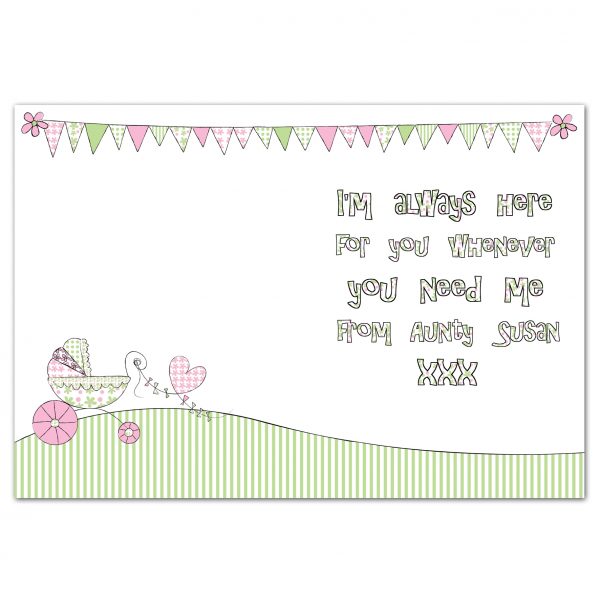 Personalise this Pram and Bunting with the child’s name of up to 15 characters and the occasion of up to 15 characters on the front. Inside add a message of up to 5 lines of 20 characters.’On your’ is fixed text.Please refrain from using special characters as this may impair the quality of the personalisation and in some cases cause it to be missed off the product.All Cards come in a brown outer envelope with a Plain White envelope inside.All cards measure 185mm x 132mm.Our great value cards include free standard delivery.Card orders received before 1pm will be dispatched the same working day.Ideal for Christening, Naming Day, Baptism, Birthdays, Holy Communion