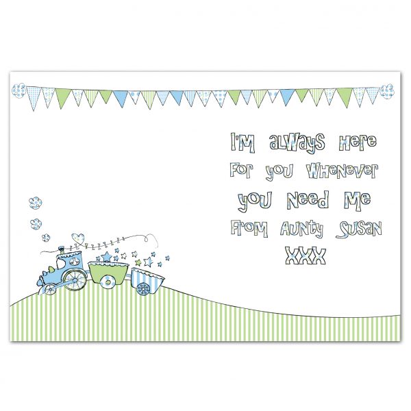 Personalise this Train and Bunting Card with the Child’s Name of up to 15 characters and the occasion of up to 15 characters on the front. Inside the card add a message of up to 5 lines of 20 characters.’On your’ is fixed text.Please refrain from using special characters as this may impair the quality of the personalisation and in some cases cause it to be missed off the product.All Cards come in a brown outer envelope with a Plain White envelope inside.All cards measure 185mm x 132mm.Our great value cards include free standard delivery.Card orders received before 1pm will be dispatched the same working day.Ideal for Baptism, Christening, Naming Day, Birthday, Holy Communion