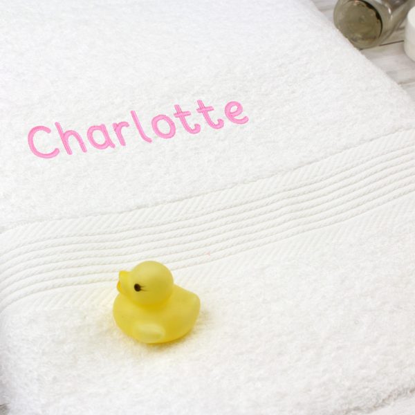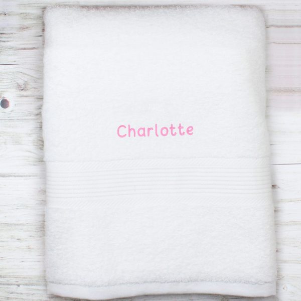 This plush white bath towel makes the perfect personalised gift for any occasion, personalise the towel with any name up to 15 characters in pink! Due to the nature of this product and the font type used please refrain from using all capitals in your personalised message.